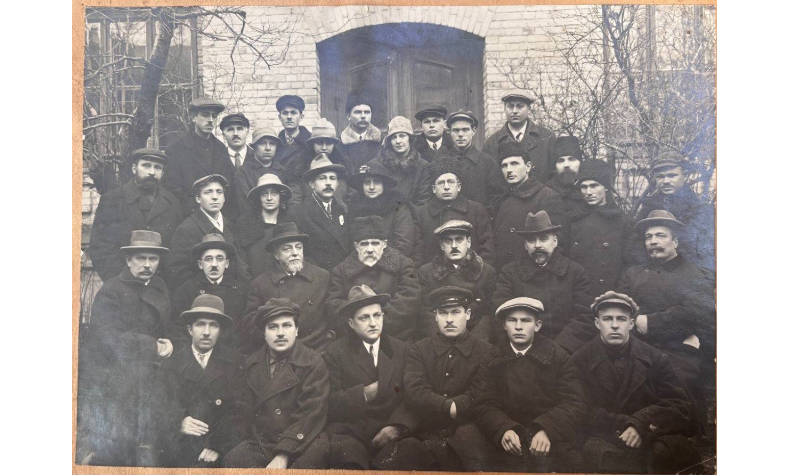 Підпис на зворотньому боці фотографії: «Профком рік? (один з 1925 1928). Стоять 1-й ряд (справа наліво 3-й Черетсін, 5-й Каменюта, 6-й Шевчук. Сидять 2-й ряд 1-й Казанський, 3-й Шевченко, 4-й Дзюбенко».