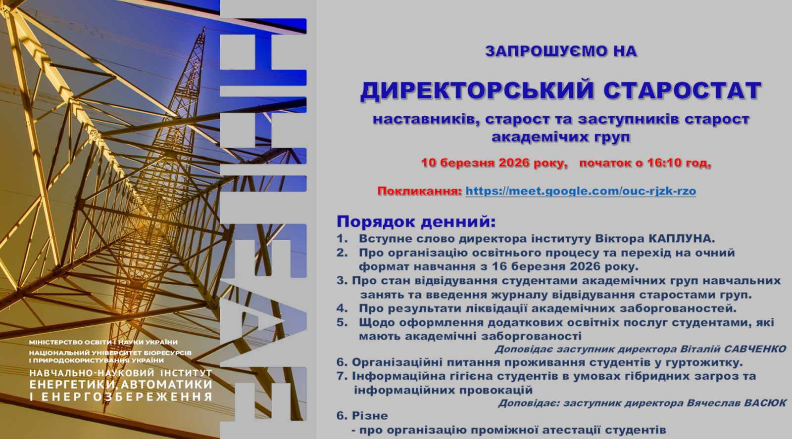Директорський старостат Запрошуємо на директорський старостат Посилання для приєднання: https://meet.google.com/ouc-rjzk-rzo 10 березня 2026 року 16:10 - 17:30 Формат: Дистанційна Тарас Лендєл к.т.н., доц. кафедри автоматики і робототехнічних систем ім. акад. І.І. Мартиненка, Координатор з цифровізації та зовнішніх комунікацій ННІ енергетики, автоматики і енергозбереження