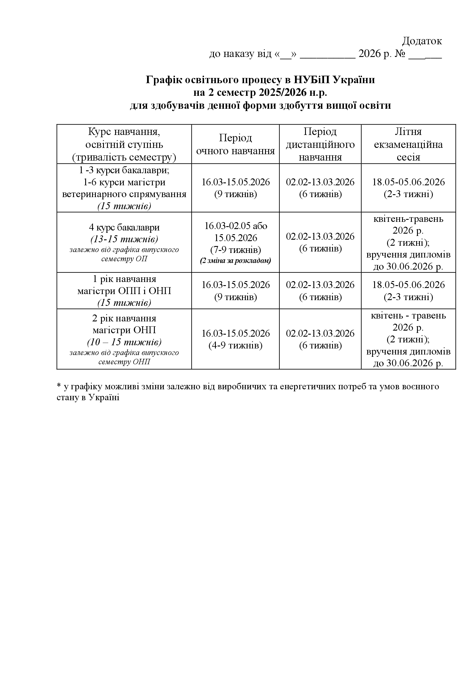 Графік освітнього процесу в НУБіП України на 2 семестр 2025/2026 н.р. для здобувачів денної форми здобуття вищої освіти (зміни) 3-6 березня 2026 року 09:00 - 09:00