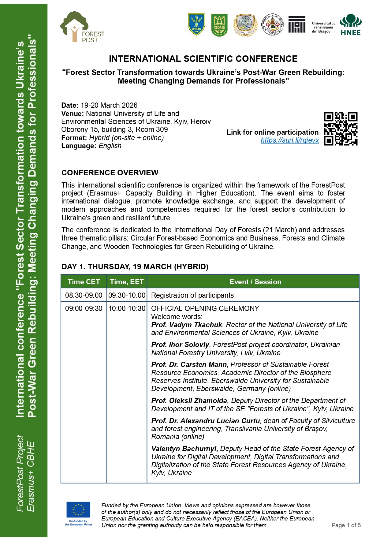 19-20 березня 2026 року в Національному університеті біоресурсів і природокористування України відбудеться міжнародна наукова конференція «Трансформація лісового сектору на шляху повоєнної зеленої відбудови України: відповідність динамічним вимогам підготовки фахівців», що проходитиме в межах проєкту Erasmus+ напряму CBHE «Модернізація магістерських програм для підтримки трансформації лісового сектору на шляху післявоєнної зеленої відбудови України (ForestPost)» (№ проєкту 101179074, ERASMUS-EDU-2024-CBHE).