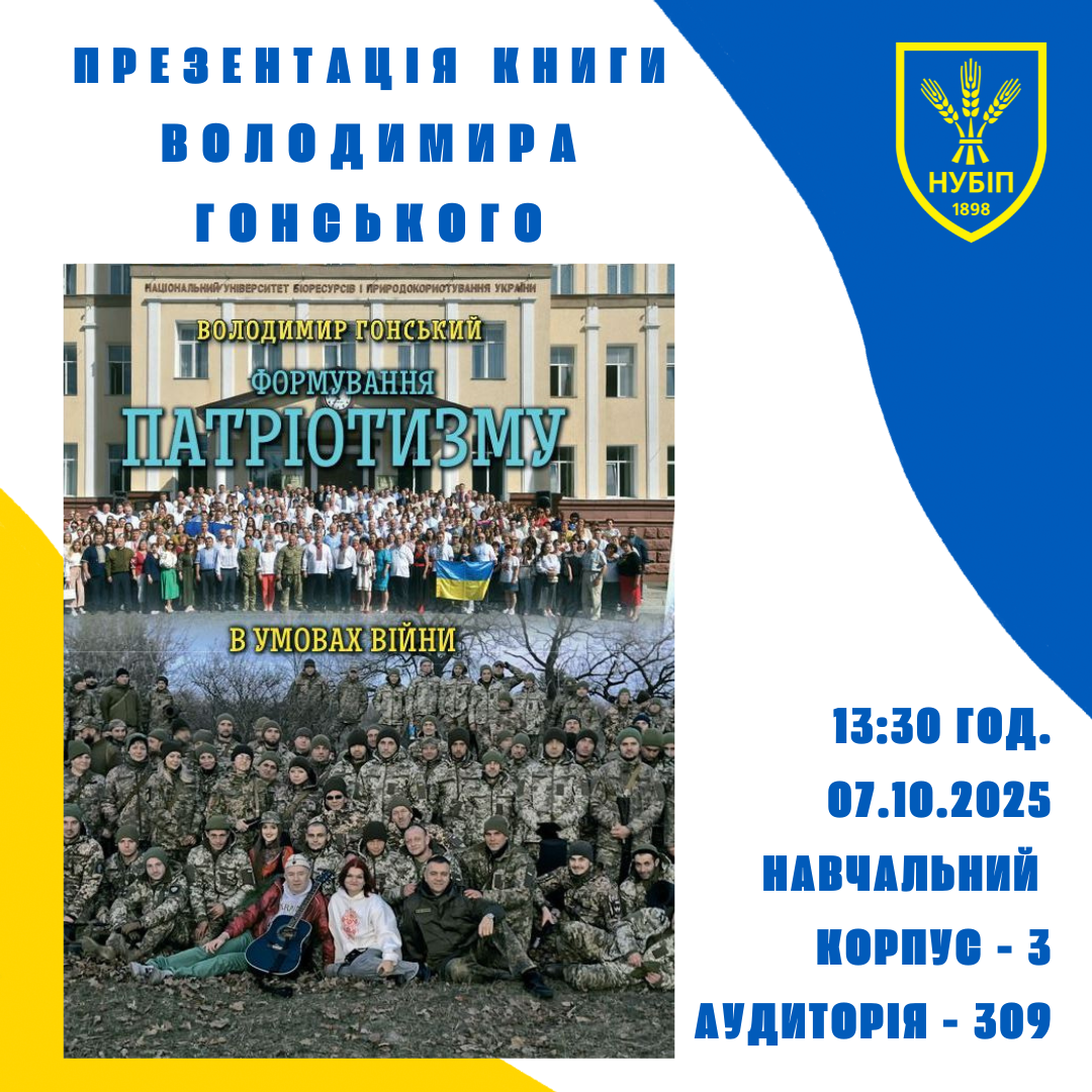Запрошуємо вас на презентацію книги Володимира ГОНСЬКОГО «Формування патріотизму в умовах війни», яка присвячена актуальним питанням виховання та зміцнення національної ідентичності в непростий для держави час.