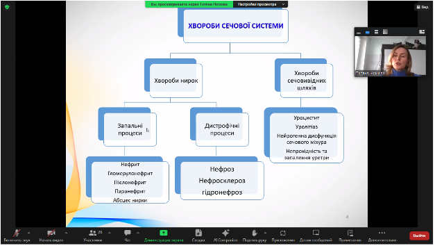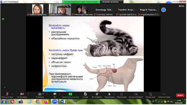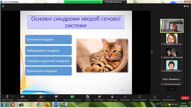 Згідно графіку проведення відкритих лекцій на факультеті ветеринарної медицини у ІІ семестрі 2025-2026 навчального року, 5 березня 2026 року проведена відкрита лекція, кандидатом ветеринарних наук, доцентом кафедри внутрішніх хвороб тварин Тетяною Анатоліївною Палюх з дисципліни «Клінічна діагностика хвороб тварин» для студентів 3 курсу ОС «Магістр» на тему: «Дослідження сечової системи у тварин». Лекція відбулася у дистанційному форматі на платформі Zoom.