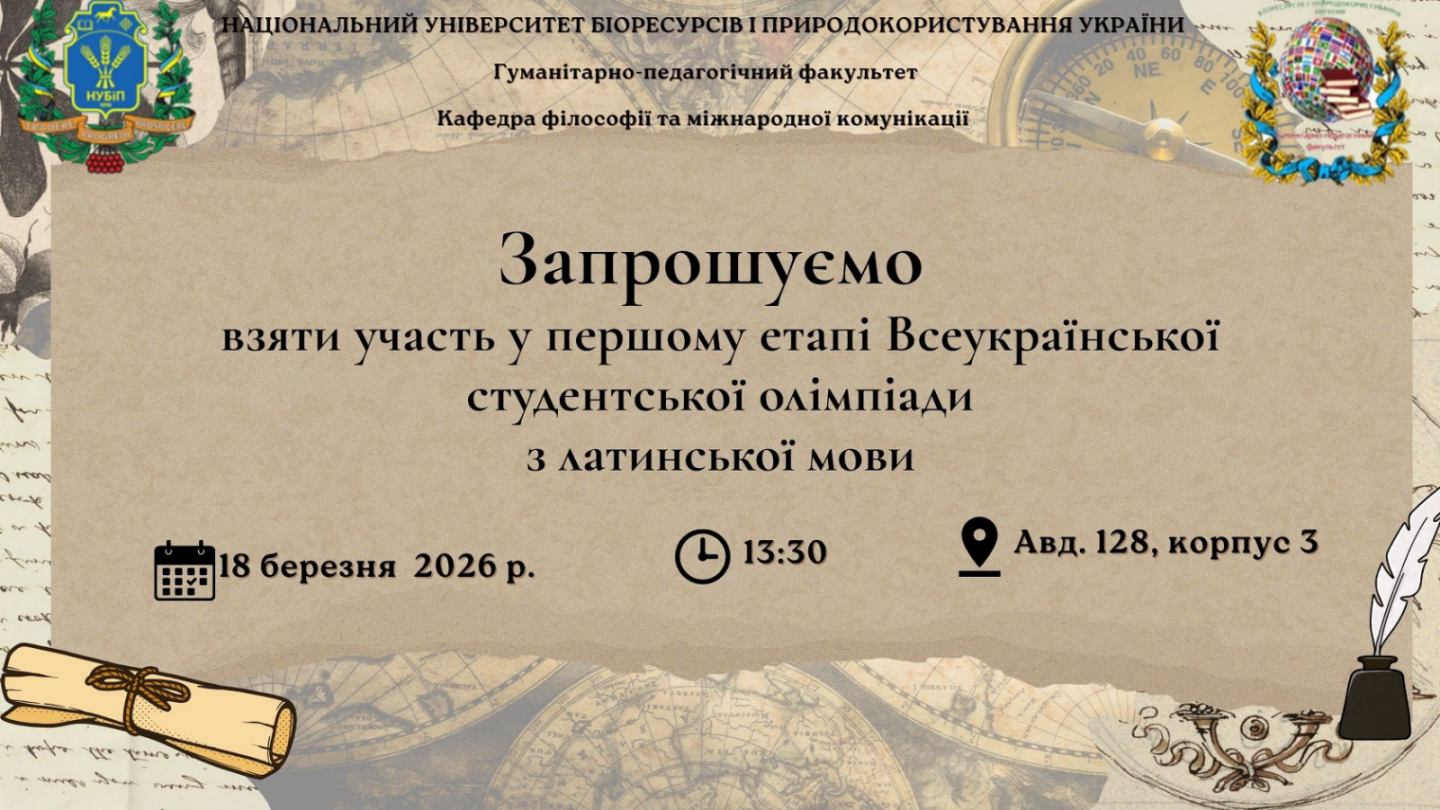 Запрошуємо до участи в І етапі Всеукраїнської студентської олімпіади з латинської мови 18 березня 2026 року 13:30 - 15:00 Формат: Очна Місце проведення: НУБіП України, м. Київ, вулиця Героїв Оборони, 15, корпус №3, ауд. 128