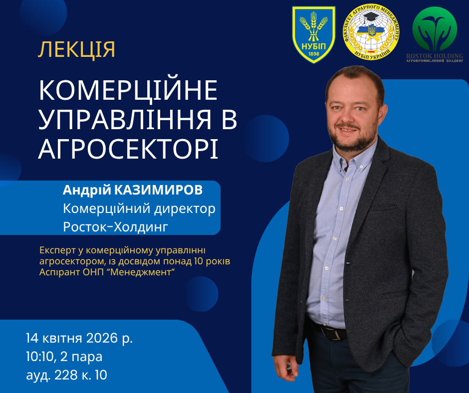 Запрошуємо на лекцію: "Комерційне управління в агросекторі" 14 квітня 2026 року 10:10 - 11:30 Формат: Очна Місце проведення: Аудиторія 228 корпус 10