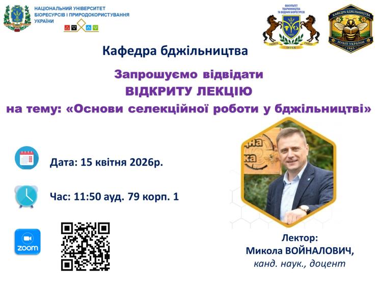 15 квітняя 2026 року о 11:50 (3 пара) відбудеться відкрита лекція з дисципліни «Технологія виробництва продукції бджільництва» для студентів ОС «Бакалавр» спеціальності 204 «Технологія виробництва і переробки продукції тваринництва».