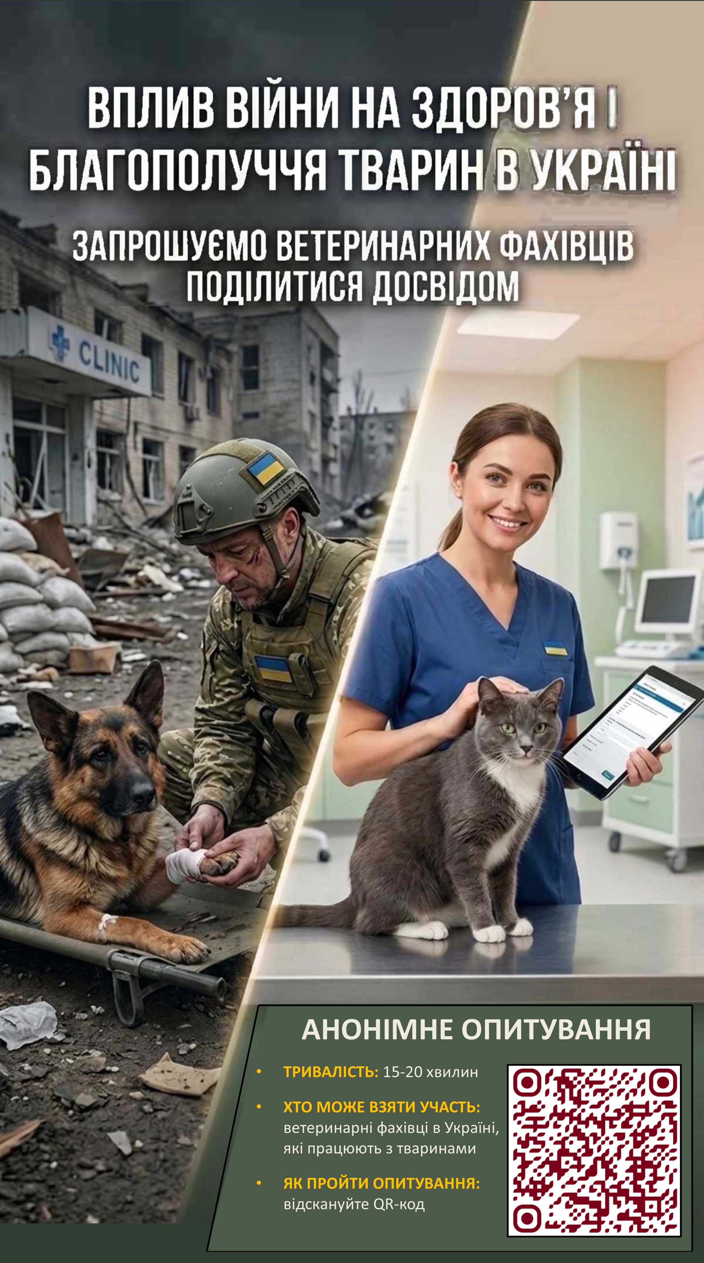 Ваш досвід допоможе сформувати об’єктивне розуміння ситуації та стане основою для розробки програм підтримки ветеринарної спільноти й покращення благополуччя тварин на національному та міжнародному рівнях.