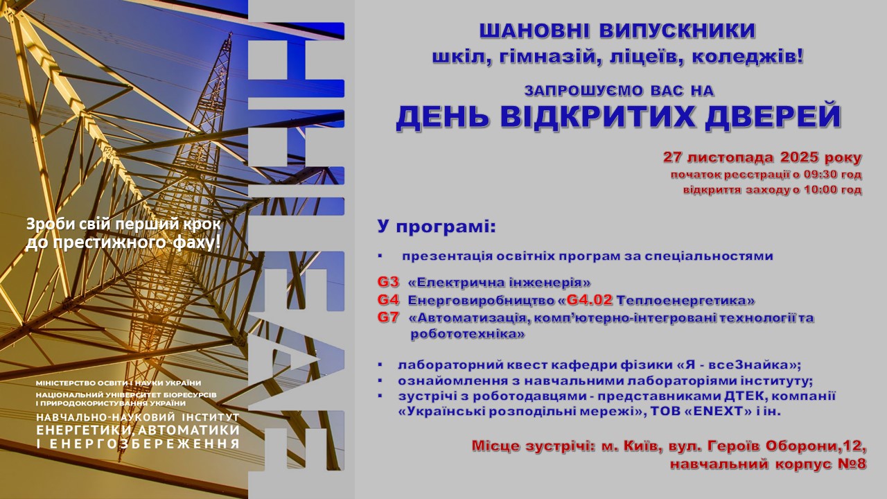 ЗАПРОШУЄМО ВАС НА ДЕНЬ ВІДКРИТИХ ДВЕРЕЙ В ННІ ЕНЕРГЕТИКИ, АВТОМАТИКИ І ЕНЕРГОЗБЕРЕЖЕННЯ НУБіП УКРАЇНИ 27 листопада 2025 року 09:30 - 16:00 Формат: Очна Місце проведення: м. Київ, вул. Героїв Оборони,12, навчальний корпус №8 Лендєл Т.І., к.т.н., доцент кафедри автоматики та робототехнічних систем ім. акад. І.І. Мартиненка