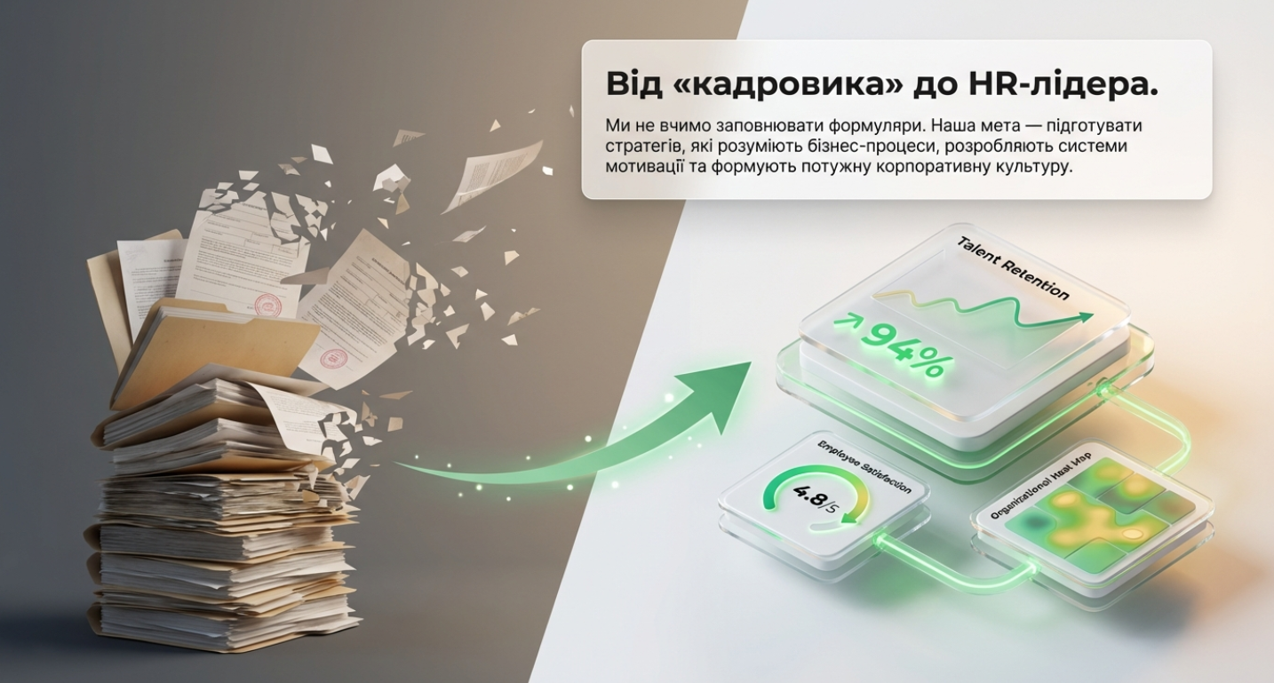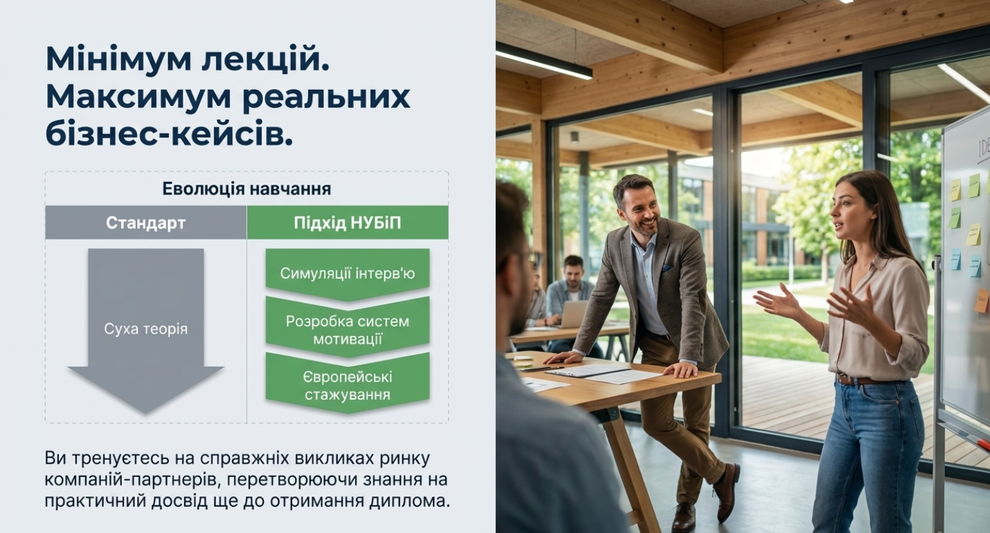 - Практична орієнтація. Навчання на прикладах реальних HR-ситуацій: підбір, мотивація, оцінювання.