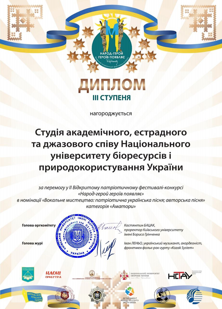 Народна студія академічного, естрадного та джазового співу Національного університету природокористування та біоресурсів України була створена на кафедрі культурології у 2002 році, народною артисткою України, професором кафедри Шелепницькою Наталією Михайлівною, яка керувала нею до 2022 року.