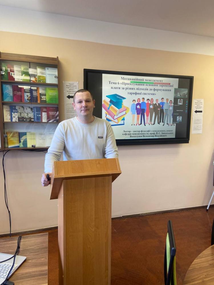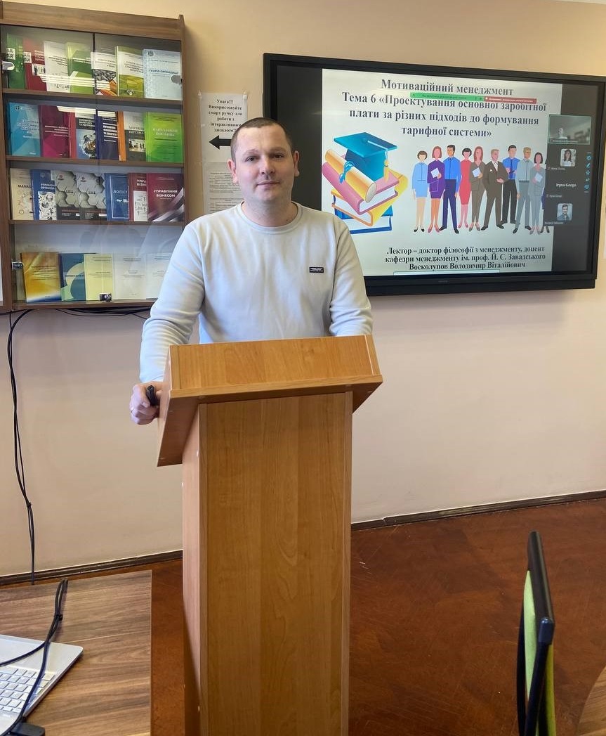 20 березня 2026 року згідно графіку відкритих лекцій 2025-2026 н. р. (ІІ семестр) доктор філософії з менеджменту, доцент кафедри менеджменту ім. проф. Й. С. Завадського Володимир ВОСКОЛУПОВ провів відкриту лекцію з навчальної дисципліни «Мотиваційний менеджмент» на тему: «Проектування основної заробітної плати за різних підходів до формування тарифної системи» для здобувачів першого (бакалаврського) рівня вищої освіти спеціальності «Менеджмент» ОПП «Менеджмент» 4 курсу.