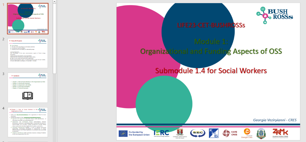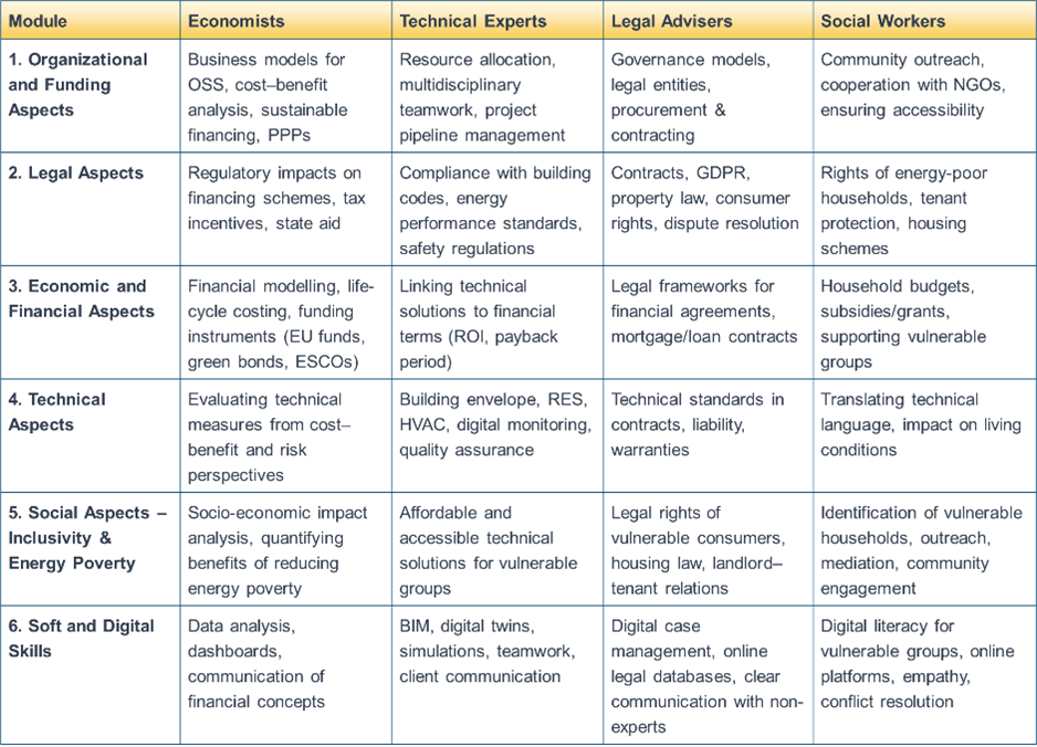 Досягнення цієї мети передбачає розробку програм підготовки та підвищення кваліфікації, які будуть апробовані у форматі навчальних курсів для ключових учасників створення та функціонування OSS. Особлива увага приділятиметься підходу «train-the-trainers», а навчання базуватиметься на модульній структурі, що забезпечить гнучкість і можливість адаптації до особливостей енергетичної реновації в різних країнах Європи.