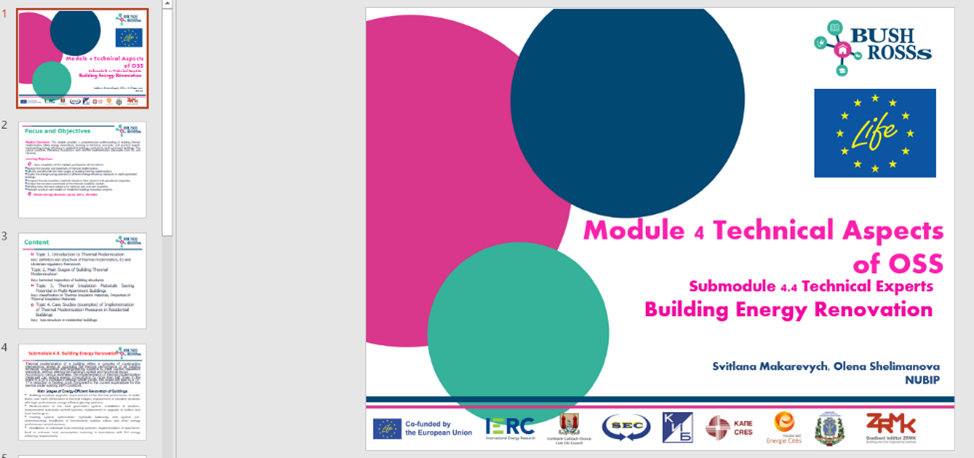 Практичний досвід показує, що стейкхолдери, відповідальні за функціонування OSS у сфері житлової реновації, потребують спеціалізованих знань і ресурсів для ефективного створення та управління такими структурами. У відповідь на цю потребу проєкт «Формування навичок для реновації житлових будівель у форматі “єдиного вікна”» (LIFE BUSHROSSs)» спрямований на розвиток компетенцій ключових інституцій — національних, регіональних і місцевих органів влади, муніципалітетів, енергетичних агентств та інших зацікавлених сторін. Це сприятиме ефективному функціонуванню OSS і забезпечить власникам житла комплексну підтримку на всіх етапах енергомодернізації.