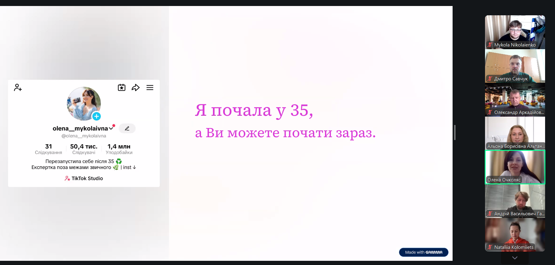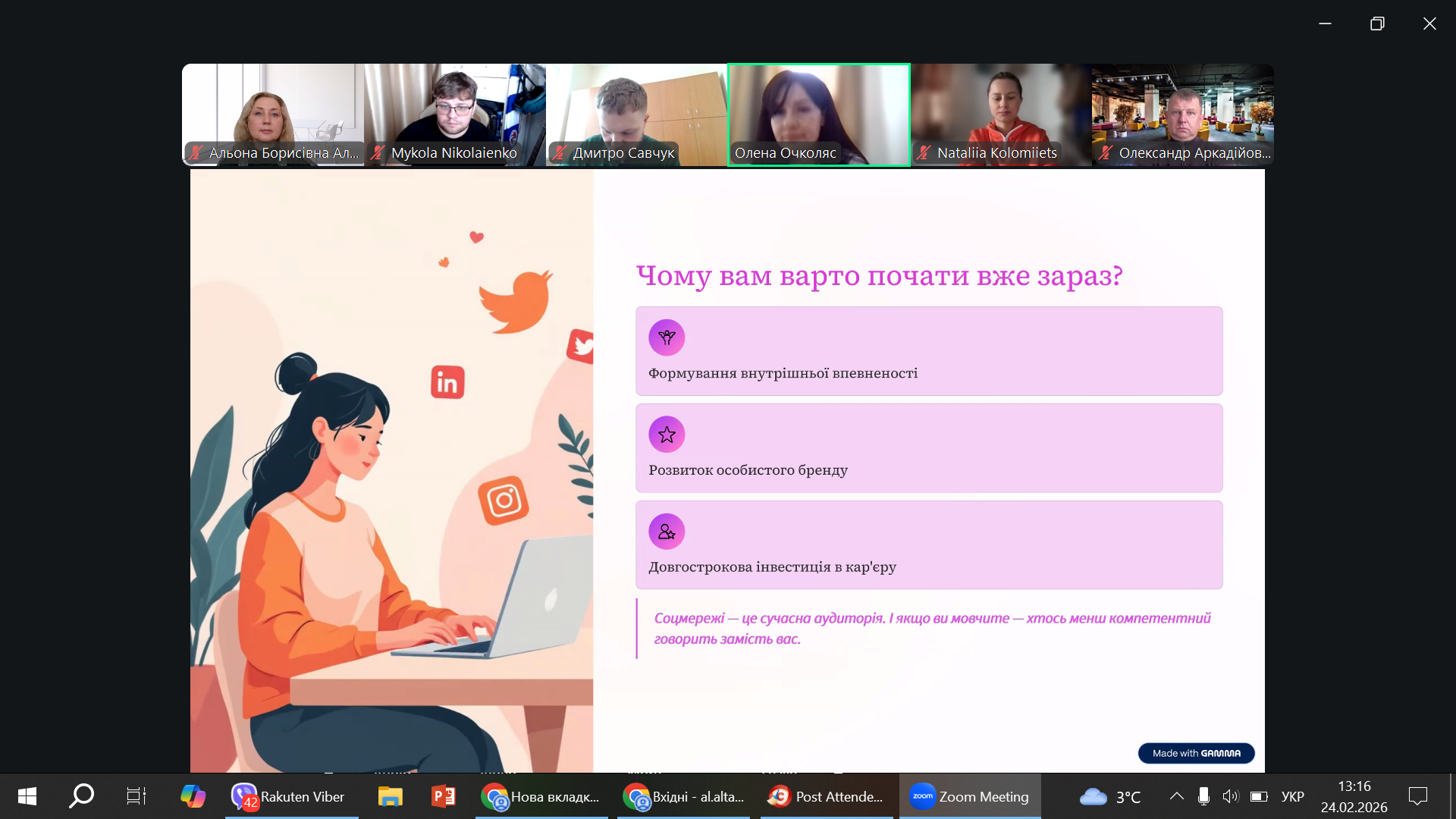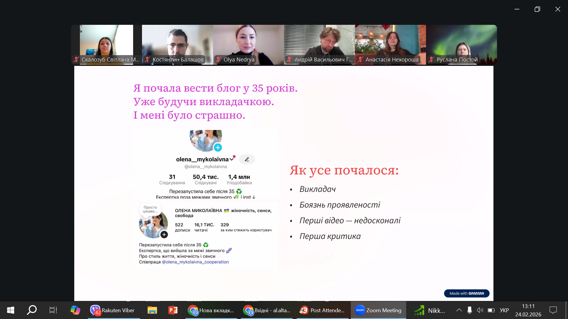 Розпочала обговорення доцент кафедри технології м’ясних, рибних та морепродуктів Олена Очколяс, поділившись власним досвідом долання психологічних бар’єрів при веденні соцмереж. Підтримали її студентка спеціальності I9 Громадське здоров’я Наталія Коломієць та магістрантка освітньої програми Марина Романова.