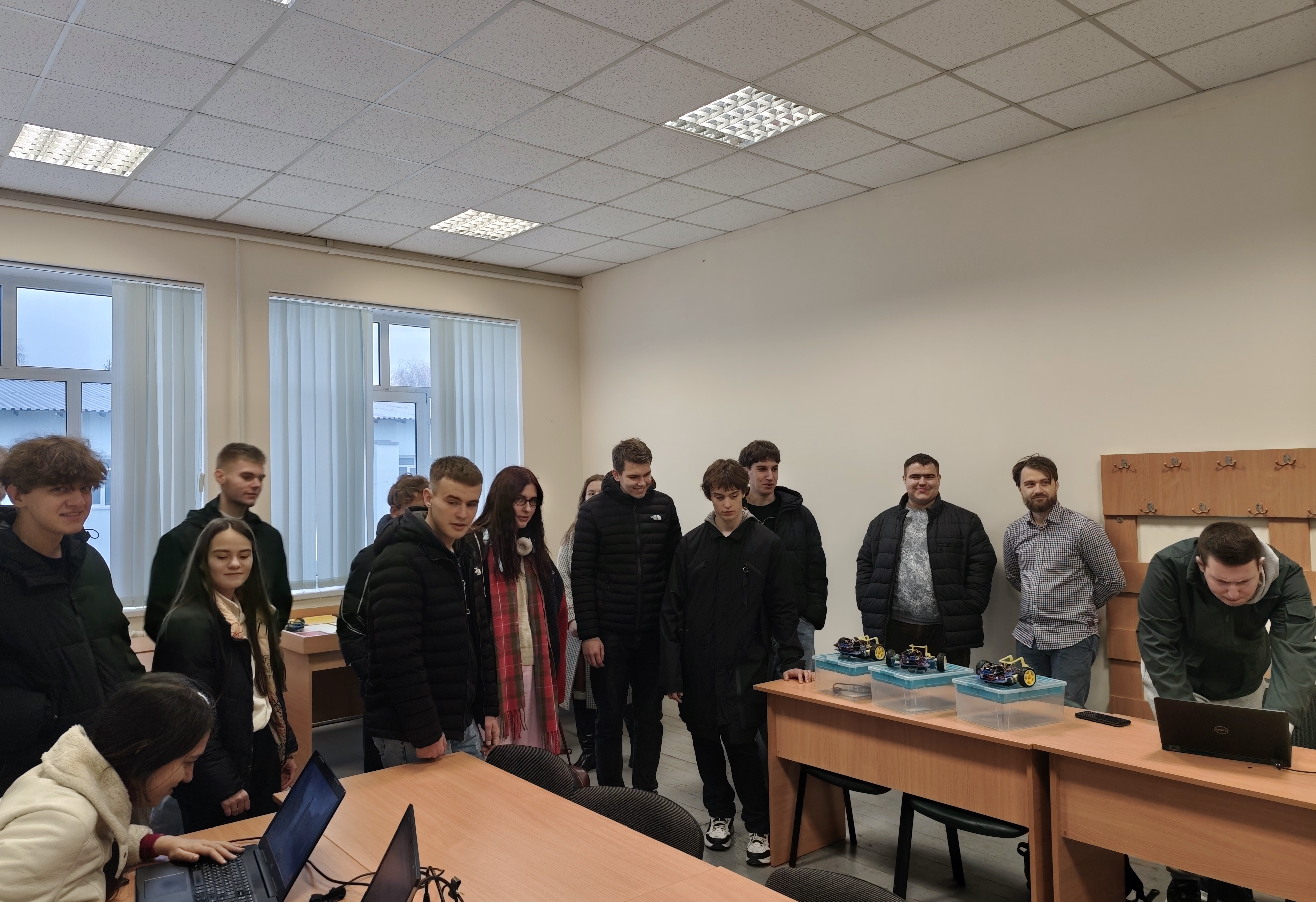 Далі екскурсія теренами факультету продовжилася у лабораторії робототехніки, де було закцентовано увагу на перевагах вибору професії за спеціальністю G11 Машинобудування та наочно продемонстровано алгоритм реалізації повного циклу створення робототехнічних систем — від 3D-моделювання та виготовлення прототипів на 3D принтері до розробки систем керування й інтелектуальних алгоритмів сучасних адаптивних механізмів.
