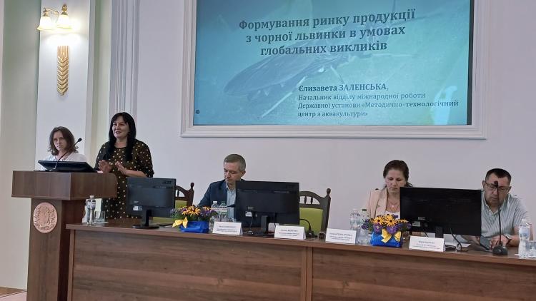 Наталія ВДОВЕНКО, д.е.н., професор, завідувач кафедри глобальної економіки НУБіП України виступила з доповіддю «Формування ринку продукції з чорної львинки в умовах глобальних викликів», з представленням результатів досліджень (0123U101944 та 0125U001973). Як співдоповідач долучилася Єлизавета Заленська, начальник міжнародного відділу Державної установи «Методично-технологічний центр з аквакультури» Держрибагентства.