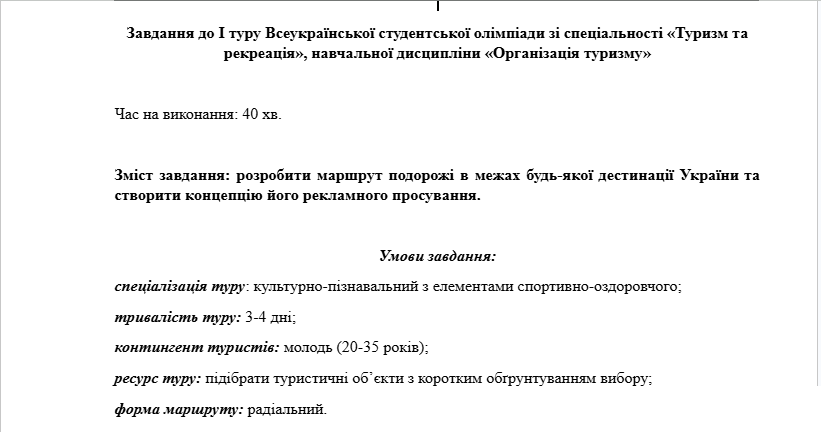 Завдання олімпіади були спрямовані на перевірку комплексних знань студентів та їх здатності застосовувати сучасні підходи у сфері туризму та готельно-ресторанної справи. Учасники виконували тестові та аналітичні завдання, розв’язували ситуаційні кейси, а також демонстрували знання сучасних тенденцій розвитку індустрії гостинності. Такий формат дозволив оцінити не лише рівень теоретичної підготовки, а й уміння здобувачів мислити стратегічно та знаходити оптимальні рішення у професійних завданнях.