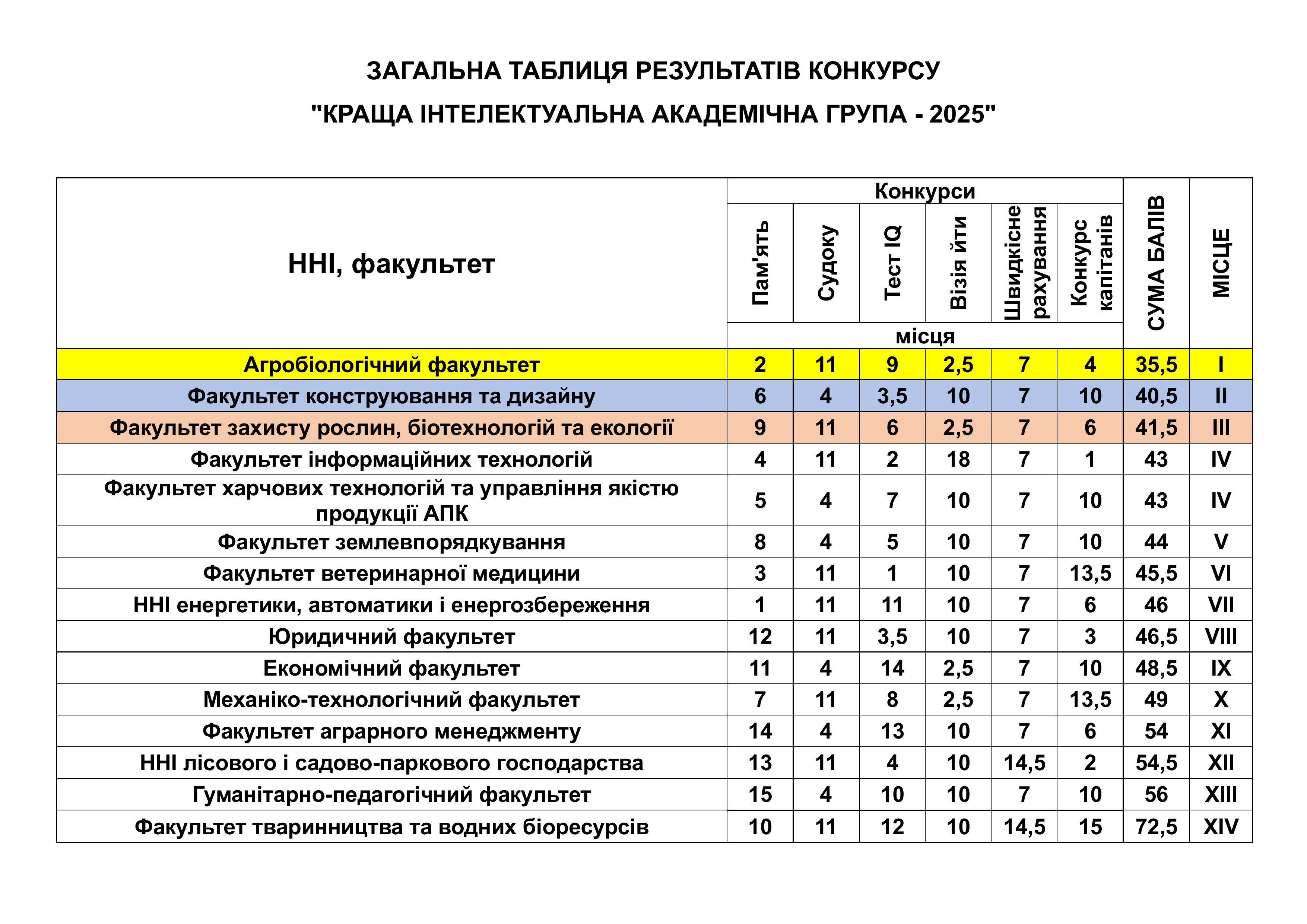 За підсумками двох днів змагань перемогу здобула команда агробіологічного факультету (35,5). Друге місце посіла команда факультету конструювання та дизайну (40,5), а третє — факультету захисту рослин, біотехнологій та екології (41,5).