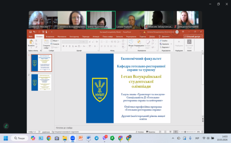 10 березня 2026 року на кафедрі готельно-ресторанної справи та туризму економічного факультету НУБіП Українивідбувся перший етап Всеукраїнської студентської олімпіади серед здобувачів другого (магістерського) рівня вищої освіти спеціальностей J2 «Готельно-ресторанна справа та кейтеринг» ОП «Готельно-ресторанна справа», J3 «Туризм та рекреація» ОП «Міжнародний туризм».