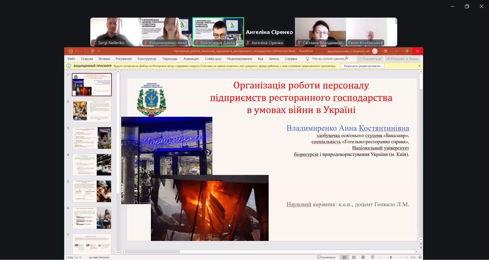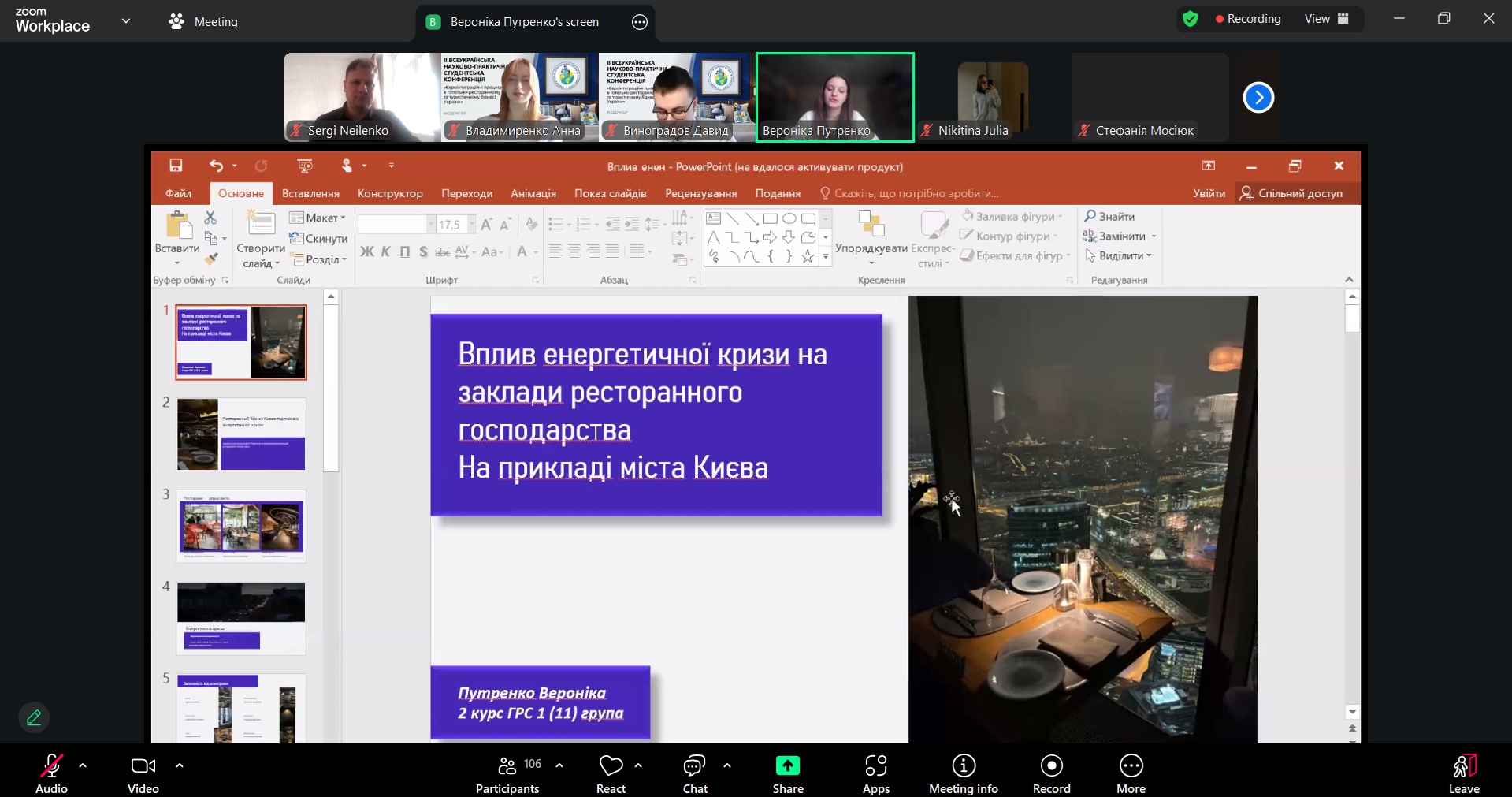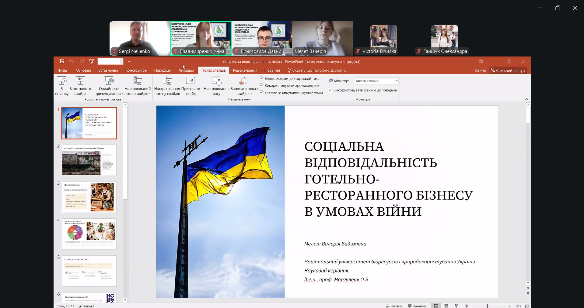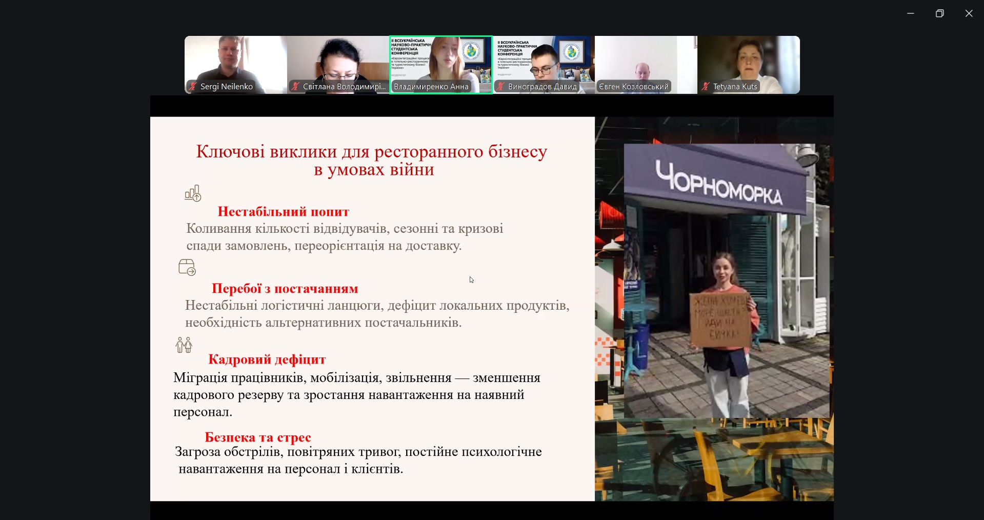 У межах конференції студенти представили доповіді, присвячені актуальним проблемам розвитку готельно-ресторанного бізнесу в умовах сучасних викликів. Тематика досліджень охоплювала питання соціальної відповідальності бізнесу, функціонування закладів ресторанного господарства в умовах енергетичної кризи, особливості роботи персоналу під час воєнного стану, а також роль інноваційних концепцій розвитку індустрії гостинності.