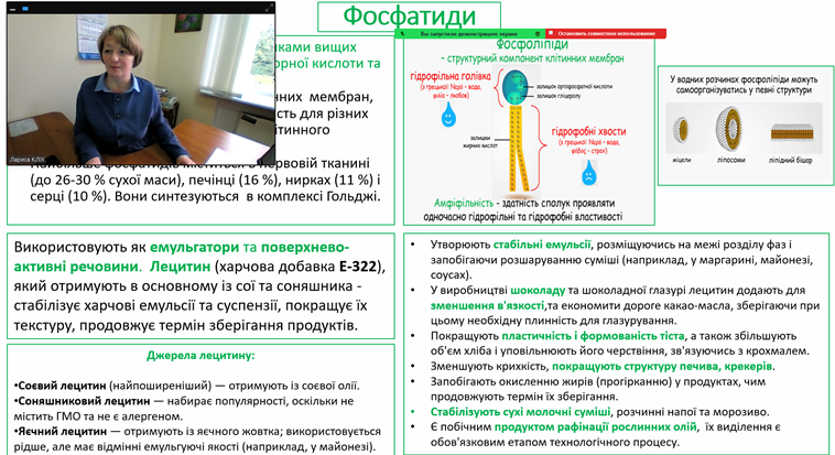 Лекція стала глибоким зануренням у світ ліпідів, їхніх функцій, ключового значення в живому організмі та, особливо, у харчовій промисловості. Розпочалась вона із застосування проблемно-пошукового методу, елементу інтерактивного навчання – демонстрації відеосюжету, який підняв проблему трансжирів у харчовій промисловості, після чого студенти спільно із викладачем шукали пояснення цього явища.