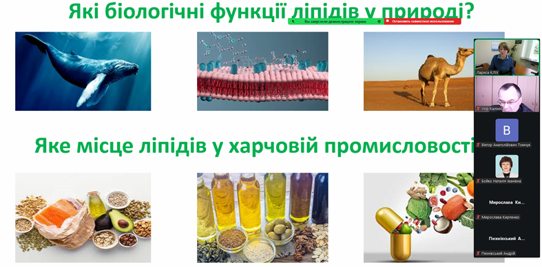 Викладач разом зі здобувачами вищої освіти на лекції обговорили питання щодо загальної характеристики ліпідів, їх значення у харчовій галузі та біології. Істотну увагу було приділено характеристиці жирних кислот як основи ліпідів.