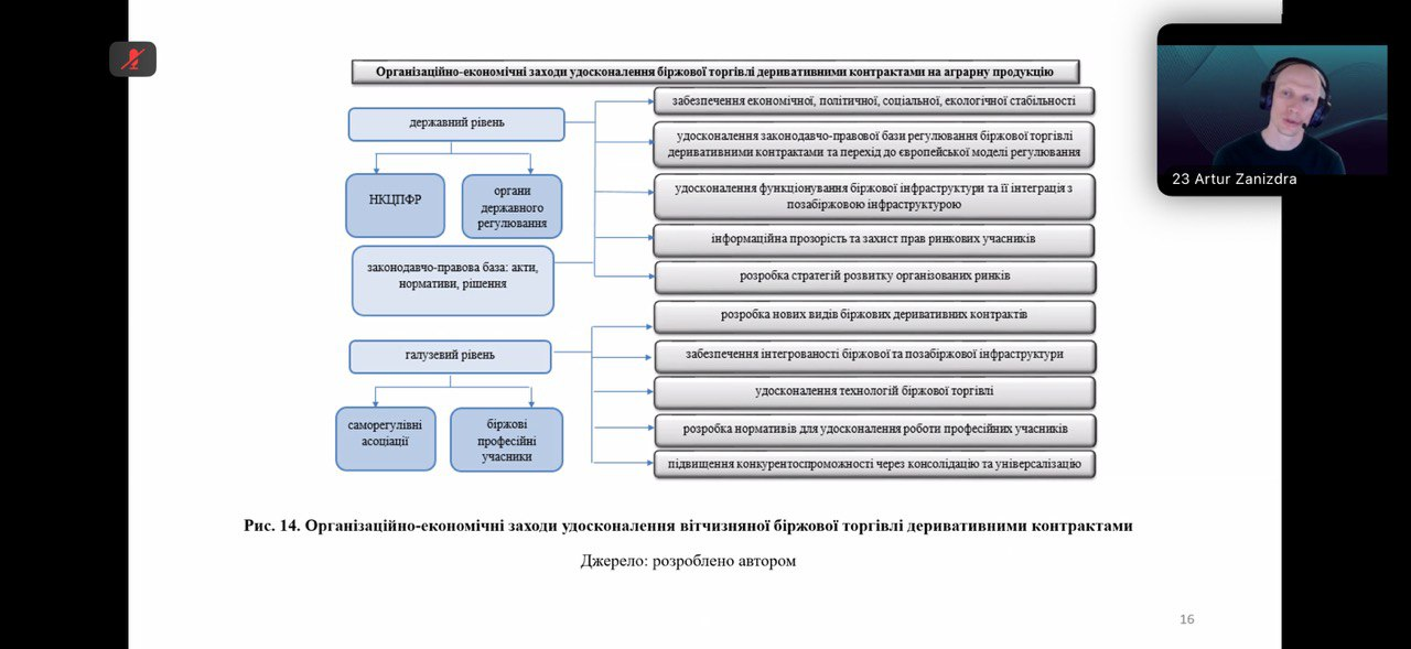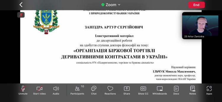 17 лютого 2026 року на кафедрі організації підприємництва та біржової діяльності було проведено фаховий семінар, на якому обговорено результати дисертаційного дослідження на здобуття ступеня доктора філософії зі спеціальності 076 «Підприємництво, торгівля та біржова діяльність» здобувача Артура ЗАНІЗДРИ на тему «Організація біржової торгівлі деривативними контрактами в Україні», науковий керівник: д.е.н., професор, член-кореспондент НААНУ, завідувач кафедри організації підприємництва та біржової діяльності Микола ІЛЬЧУК.