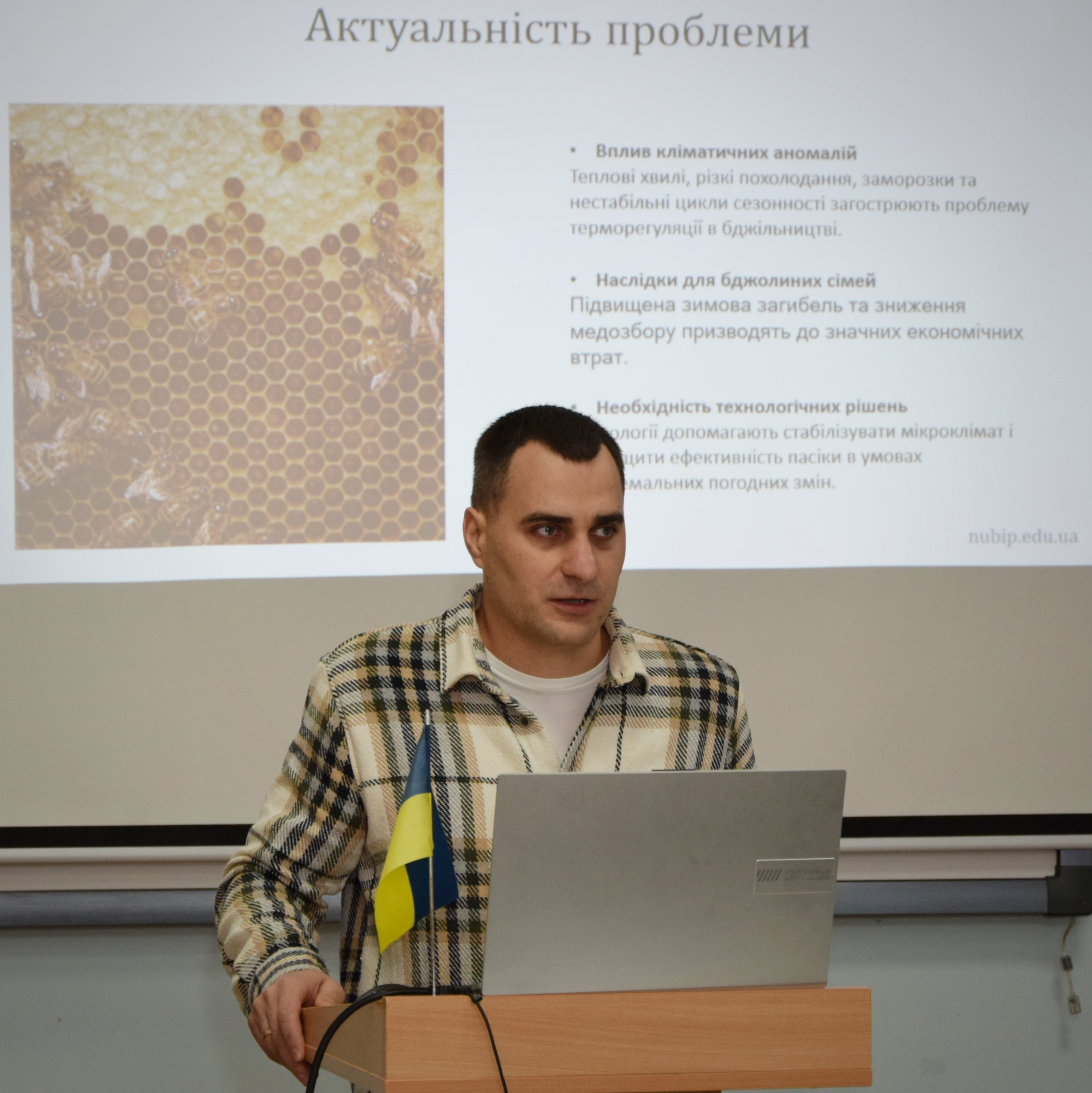 Доцент Ігор ГОЛОВЕЦЬКИЙ представив результати багаторічних селекційних досліджень у доповіді «Характеристика господарсько-корисних ознак бджіл внутрішньопородного типу “Хмельницький”». Він охарактеризував основні морфометричні та продуктивні показники цього типу, звернувши увагу на його високу медову продуктивність, добру зимостійкість і стійкість до хвороб. Доповідач окреслив перспективи подальшої селекційної роботи, спрямованої на збереження цінного генетичного фонду українських бджіл і підвищення їх адаптивного потенціалу в умовах кліматичних змін.