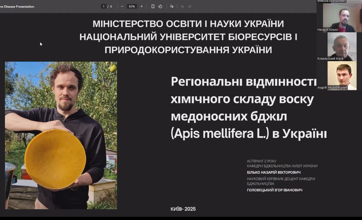 Аспірант Назарій Білько представив результати аналізу регіональних відмінностей хімічного складу воску медоносних бджіл (Apis mellifera L.) в Україні, які мають практичне значення для стандартизації та оцінки якості продукції.