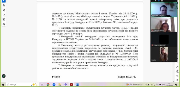 05 березня 2026 р. на виконання наказу ректора НУБіП України №116 «Про проведення І туру Всеукраїнського конкурсу студентських наукових робіт з галузей знань і спеціальностей у 2025/2026 навчальному році» від 13.02.2026 р. відбулась онлайн-зустріч студентів-учасників наукового гуртка «Основи наукових досліджень в агробізнесі» із його керівником. Під час зустрічі було узгоджено тематику і виконавців наукових робіт, які приймуть участь у конкурсі зі спеціалізації «Менеджмент ЗЕД» та «Адміністративний менеджмент». Більше того, було прийнято рішення подати наукові роботи для розгляду конкурсній комісії до 15 березня 2026 р.