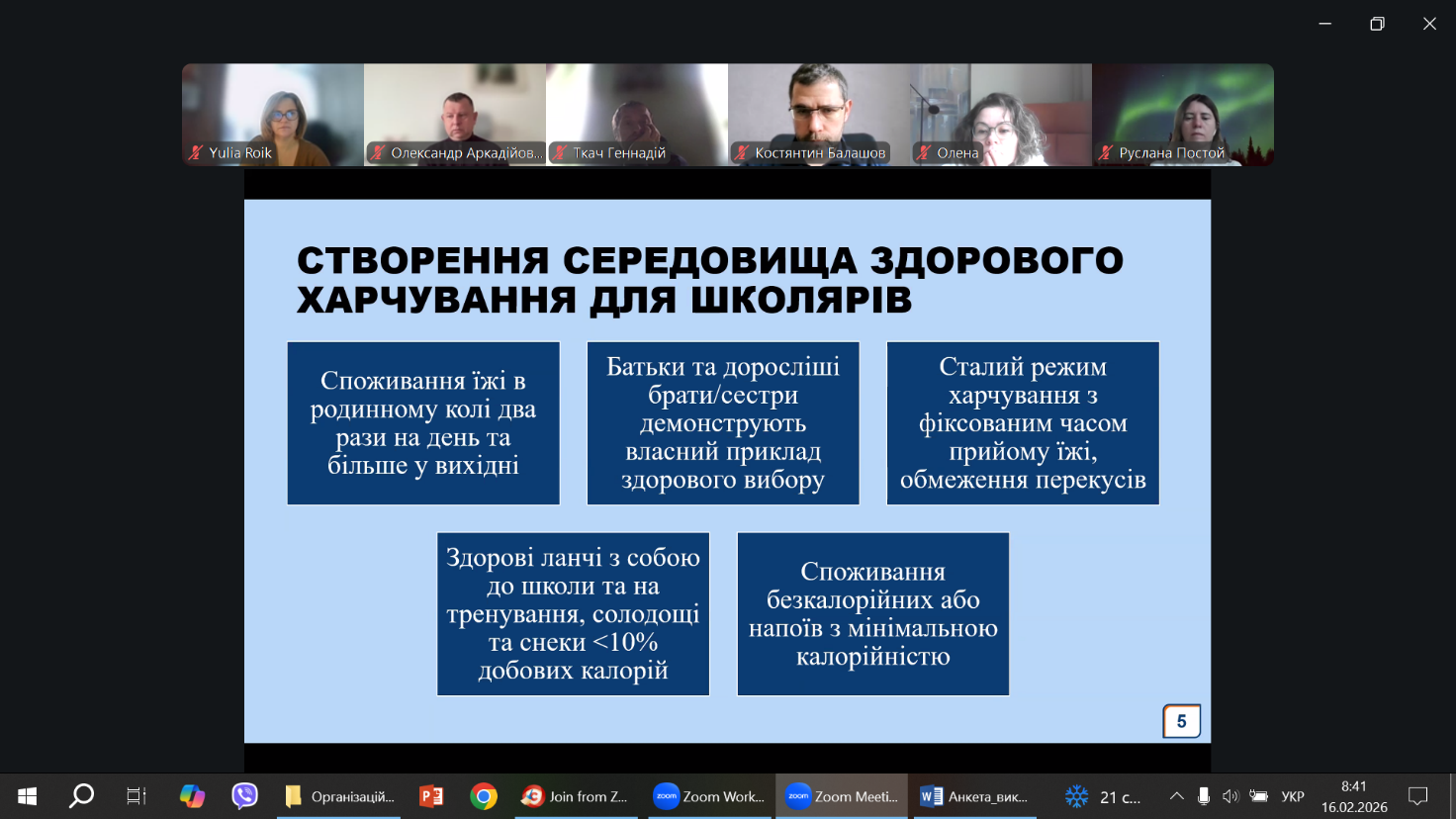 Лектор акцентував увагу на питаннях створення середовища здорового харчування для школярів; принципах здорового харчування в закладах освіти; рекомендаціях щодо споживання окремих груп харчових продуктів та води; обмеженнях щодо споживання солі, цукру та кофеїну; напрямках вдосконалення нормативно-правової бази з організації шкільного харчування; принципах планування меню у закладах освіти; комунікаційній підтримці реформи.