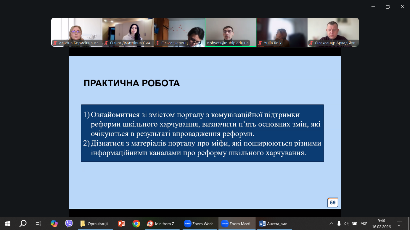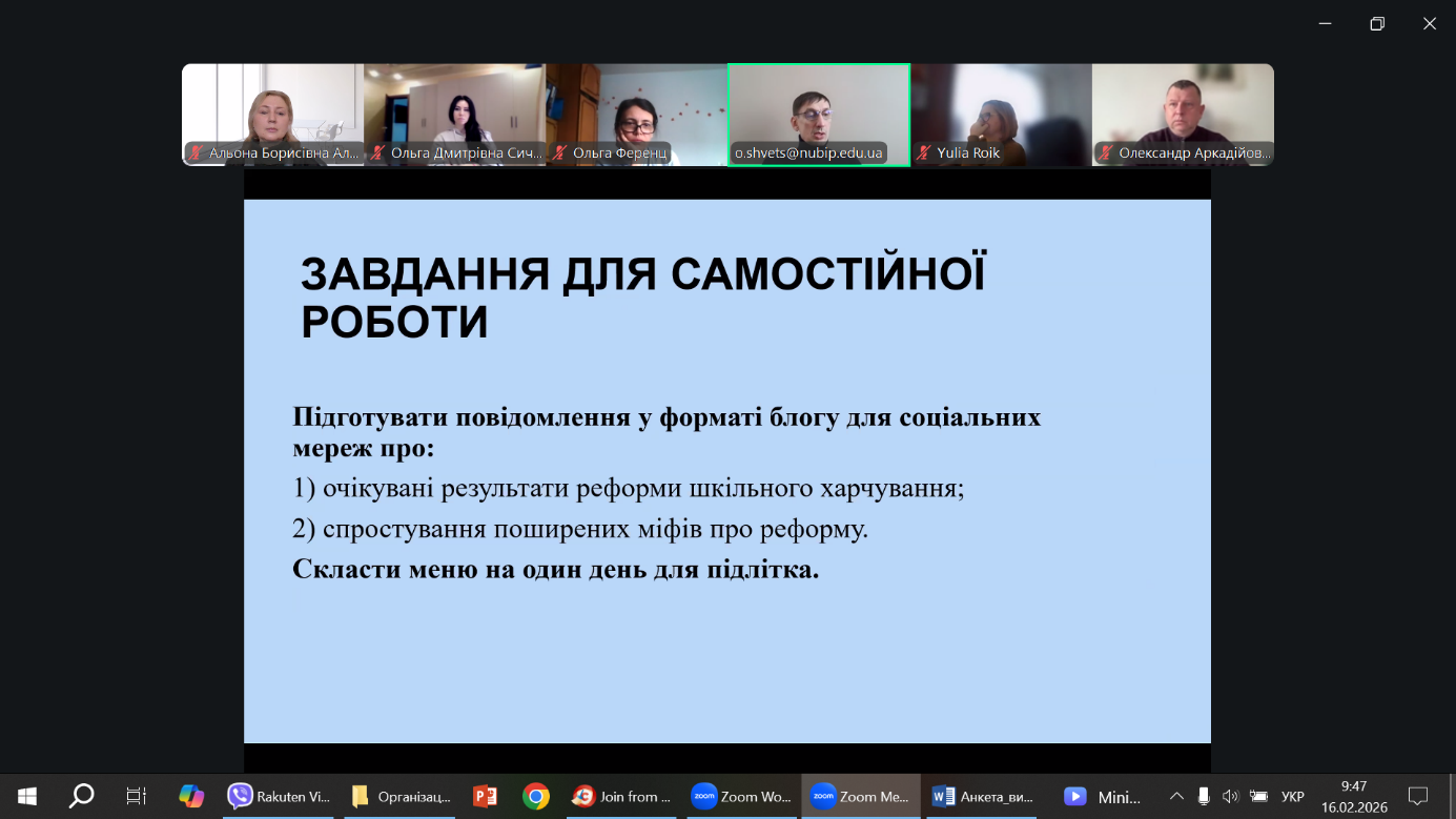 Актуальність та сучасність змісту заняття не викликає сумнівів. Як відомо, реформа шкільного харчування в Україні розпочалась у 2020 році за ініціативи першої леді Олени Зеленської. Це починання згуртувало навколо себе однодумців, серед яких представники профільних міністерств, державних органів та структур, партнерів, громадських активістів, науковців.