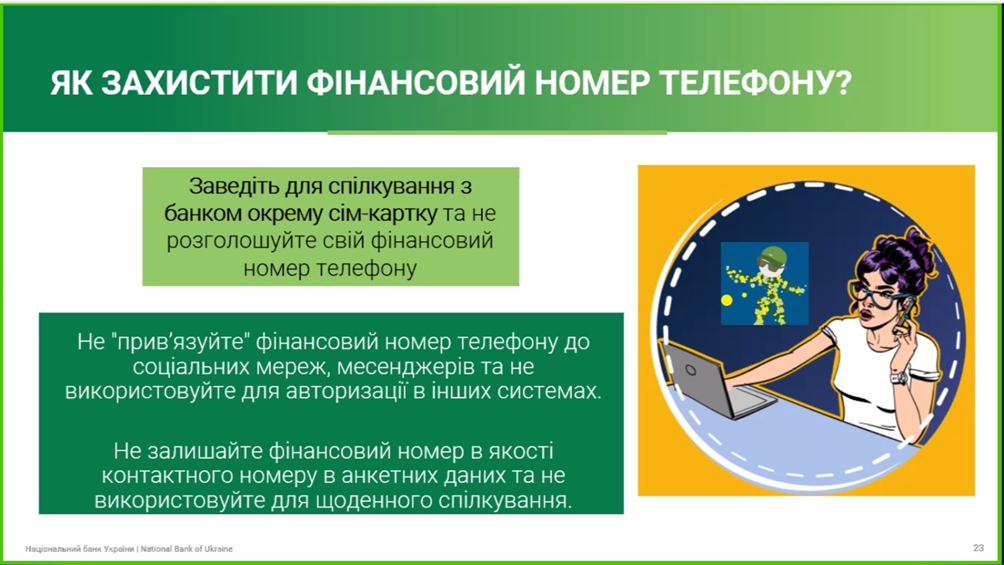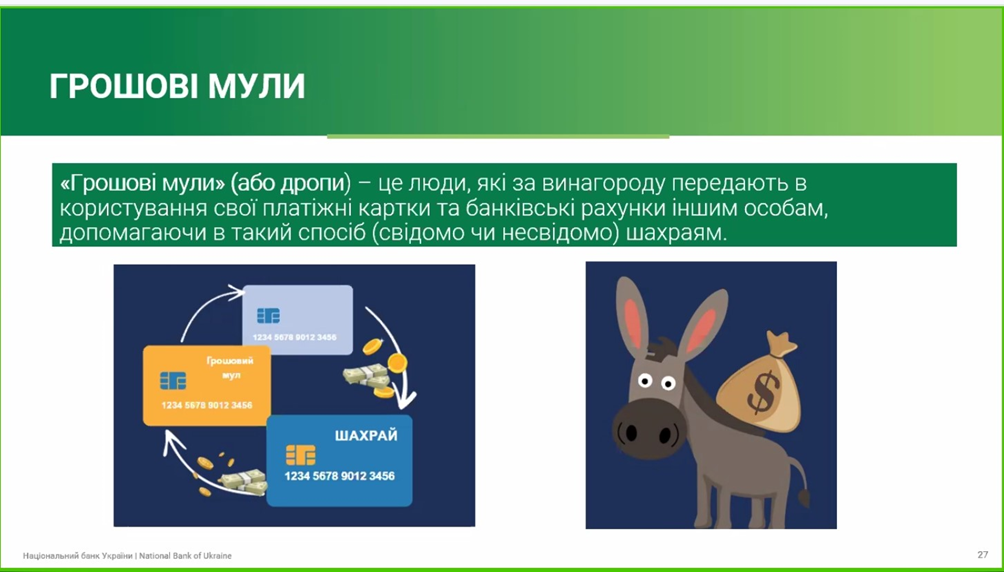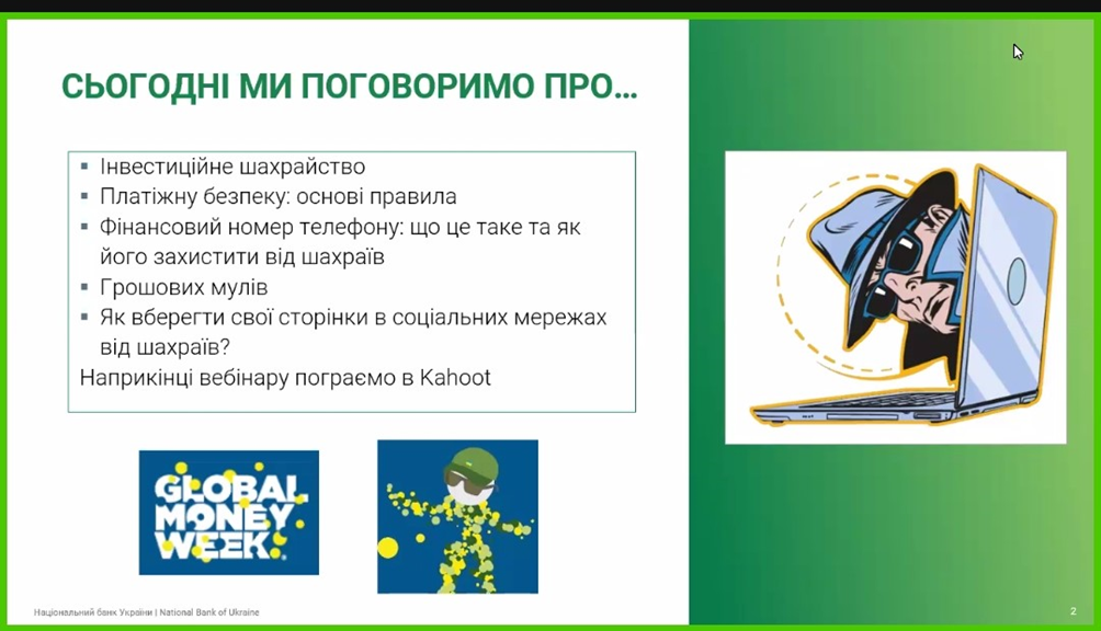 Тема вебінару є актуальною на сьогодні. Учасники у ході вебінару дізналися про найпоширеніші шахрайські схеми та як вони працюють. Також отримали теоретичну інформацію та практичні рекомендації як можна розпізнати шахрайські схеми; що таке фінансовий номер телефону та як його захистити; як можна захистити персональні дані та персональний фінансовий номер; як розпізнати шахрайські пропозиції «легкого заробітку» в інтернеті; як безпечно купувати онлайн та уникати фейкових продавців; як відрізнити шахрайський сайт від справжнього; як захистити свої акаунти в соціальних мережах і месенджерах та ще багато чого цікавого та корисного. Пані Тетяна познайомила слухачів із поняттям “грошові мули”.