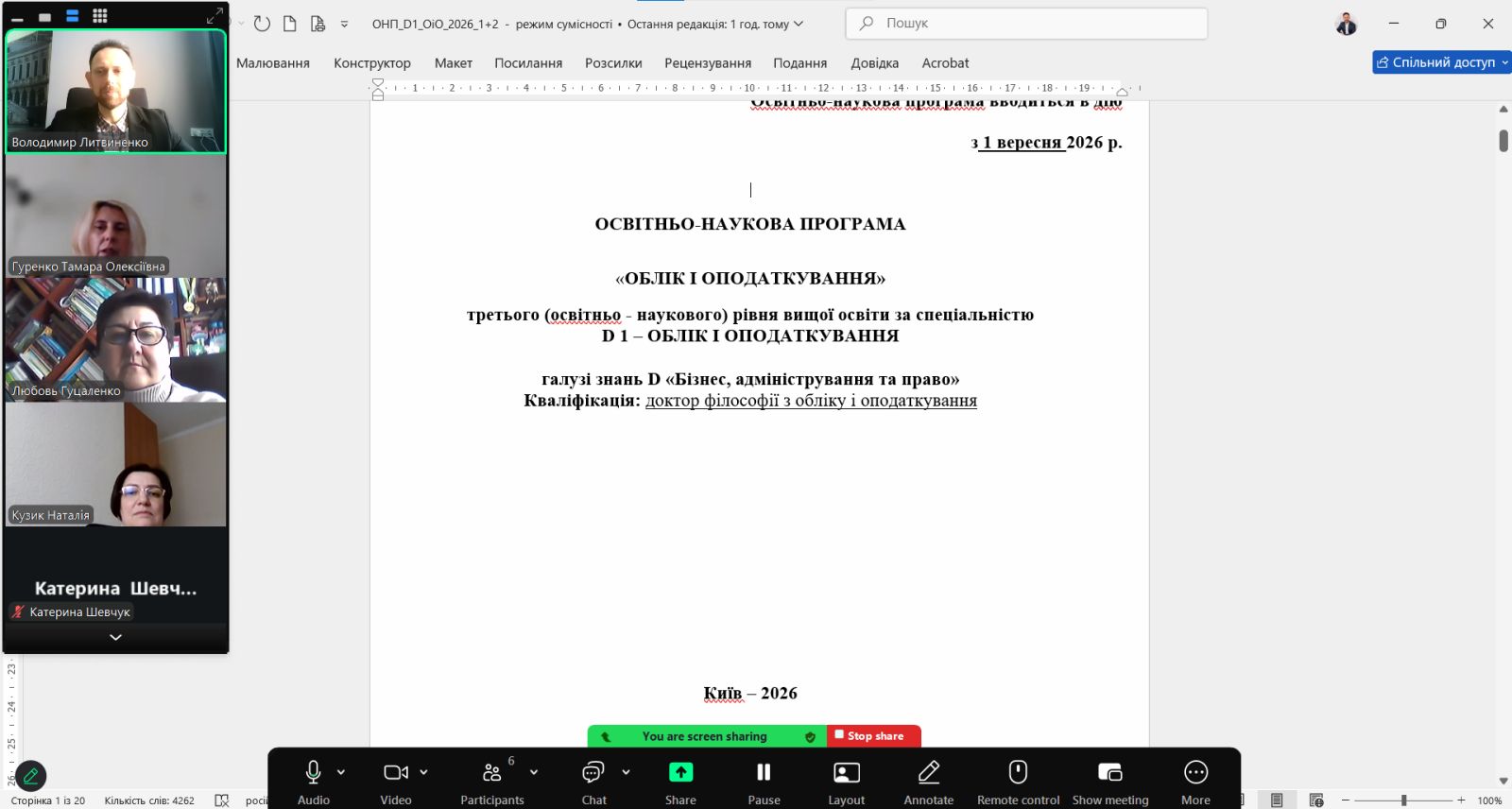 15 січня 2026 року відбулося обговорення проєктів освітніх програм «Облік і аудит» першого (бакалаврського) та другого (магістерського) рівнів вищої освіти і проєкту освітньо-наукової програми «Облік і оподаткування» третього (освітньо-наукового) рівня вищої освіти спеціальності «Облік і оподаткування». Засідання проходило за участю членів проєктних груп.