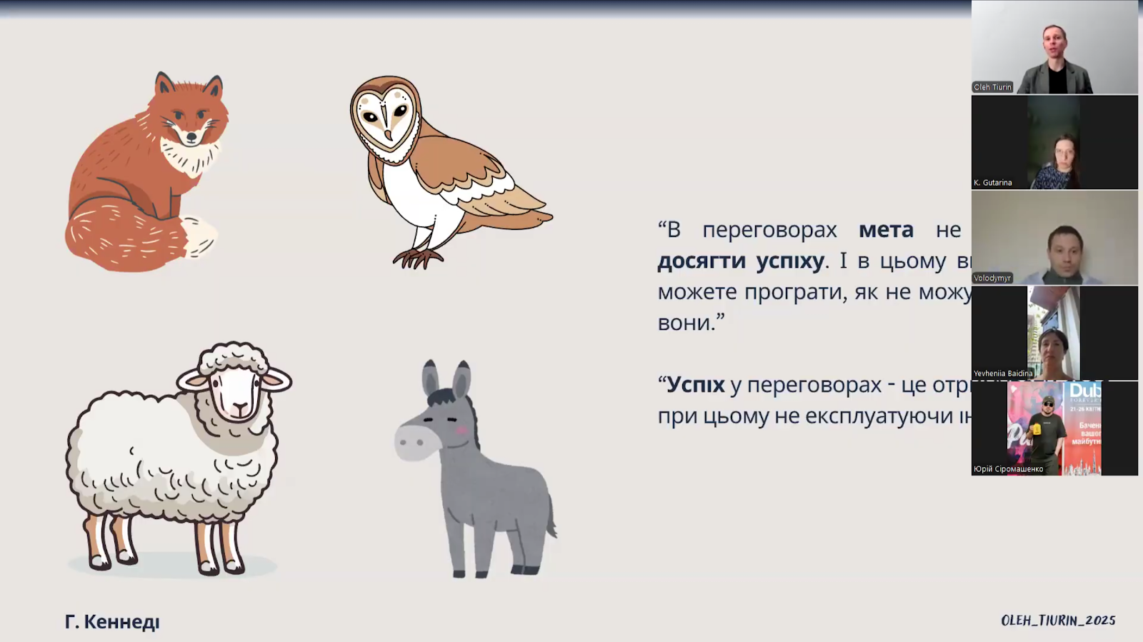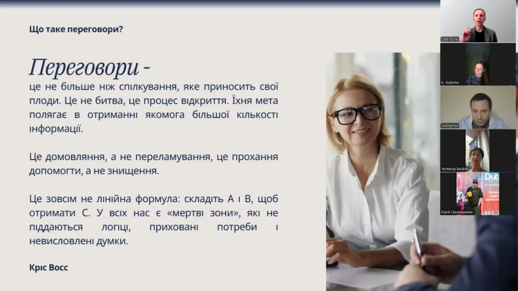 Під час першої сесії тренер — бізнес-медіатор Олег Тюрін — разом з учасниками опрацював тему переговорів. Зокрема, розглянули: