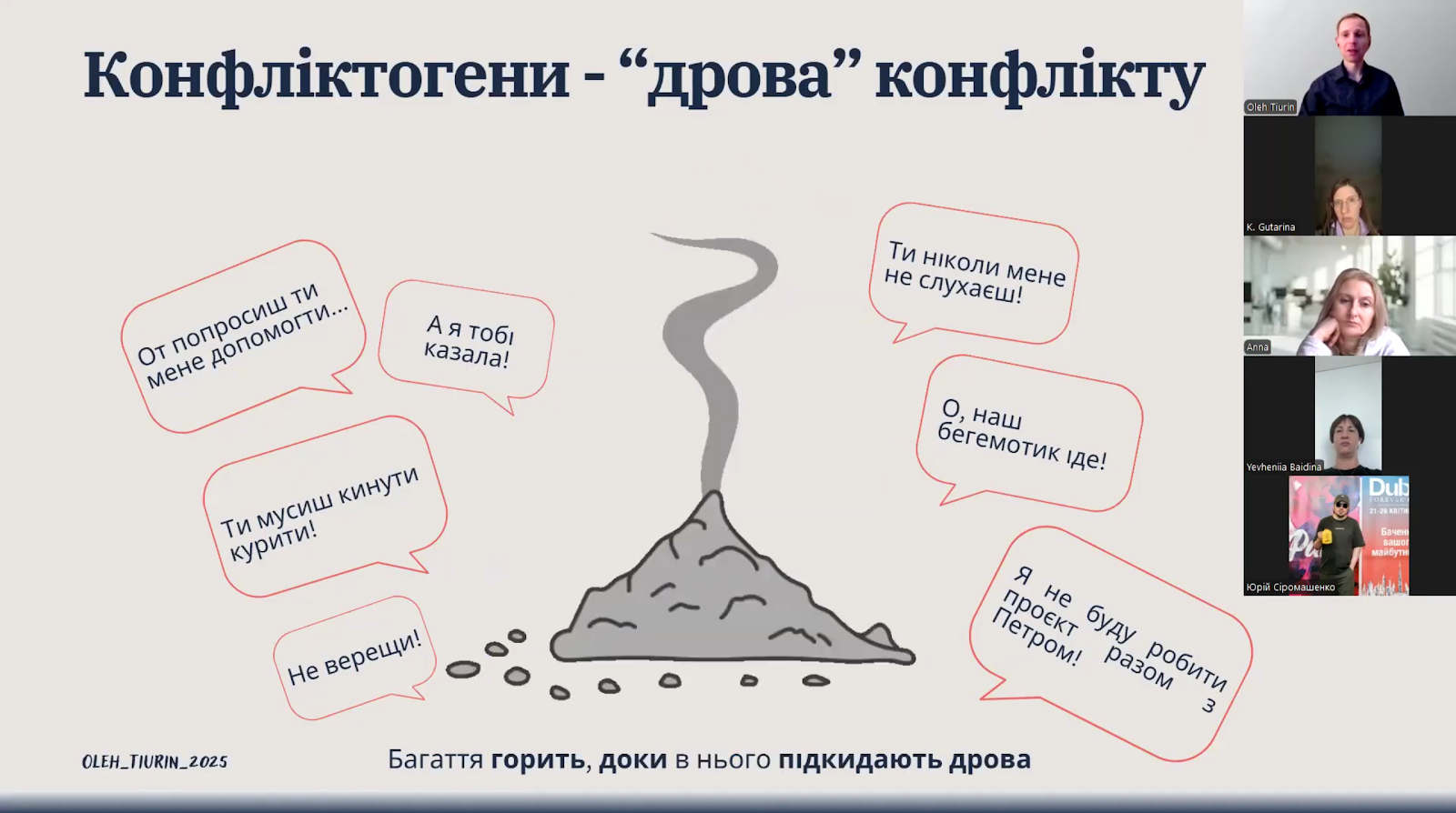 Третю сесію тренер присвятив темі конфліктогенів — слів, дій або бездіяльності, які підвищують емоційну напругу та можуть посилювати конфлікт.