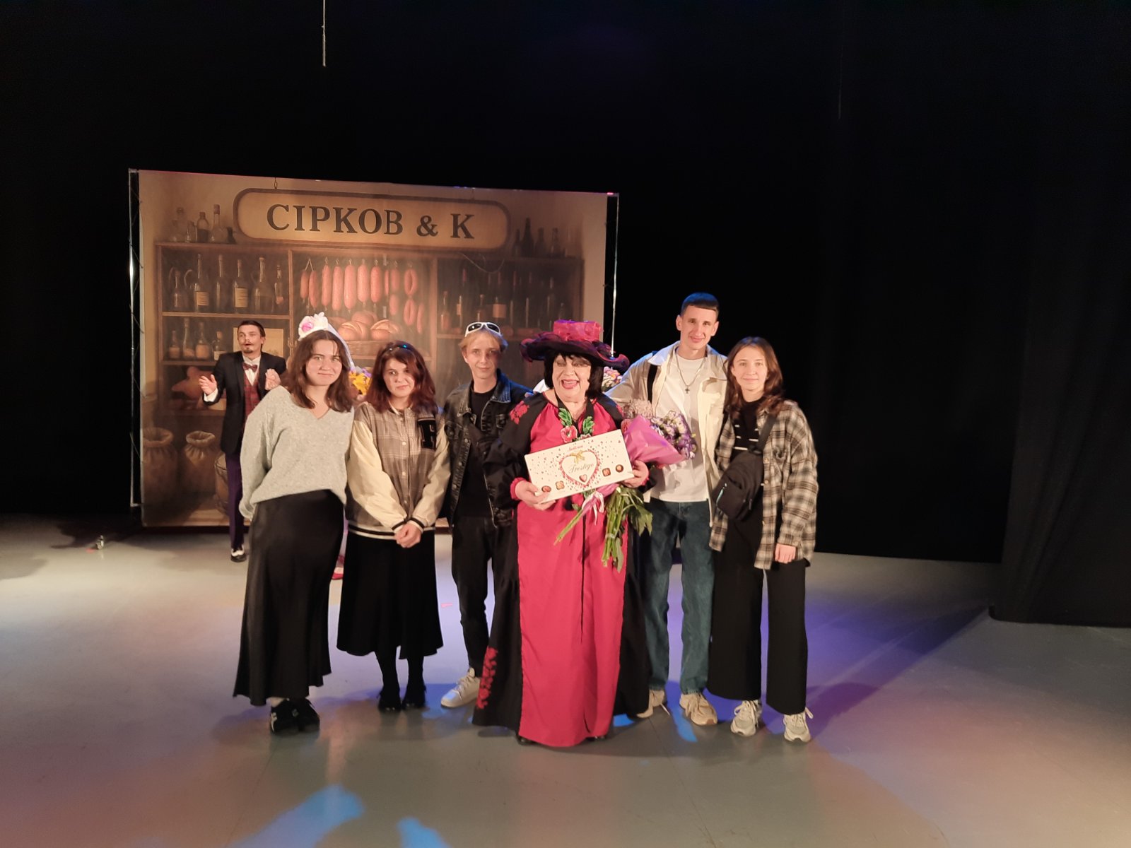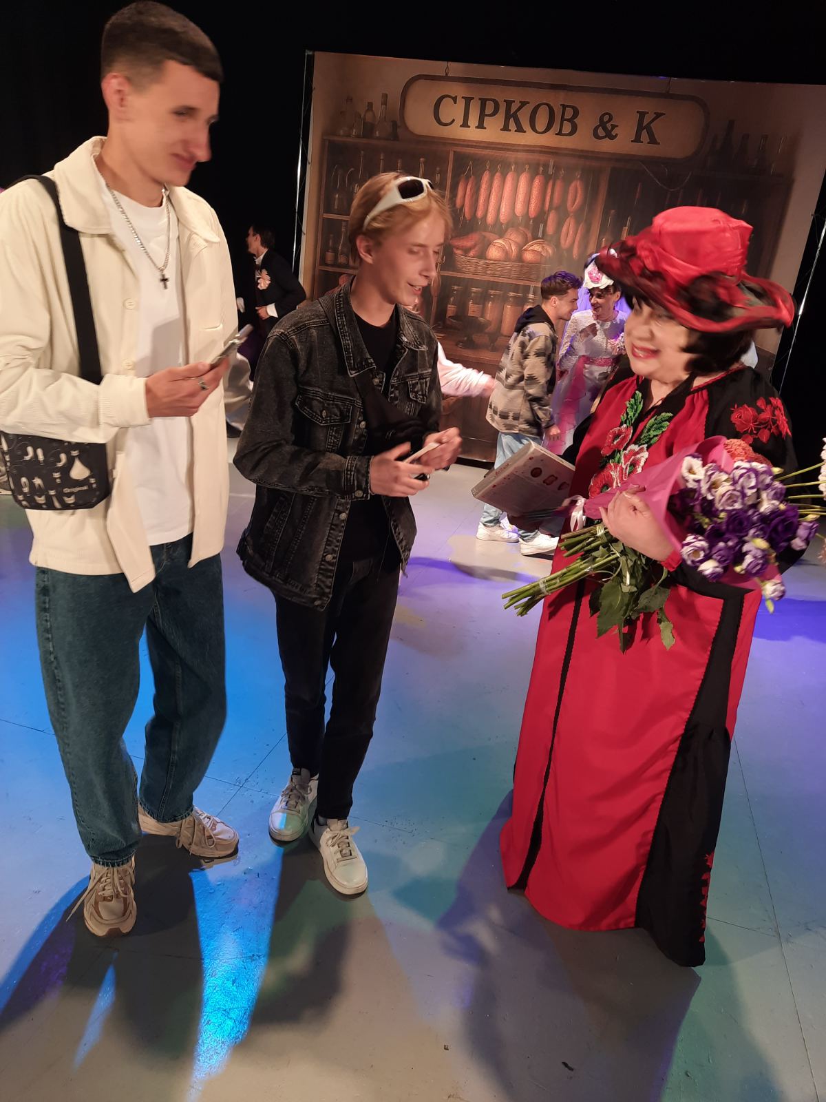 На виставу ми прийшли з букетом квітів і наприкінці спектаклю вручили його народній артистці України Тамарі Яценко, яка втілює образ матері Проні, але за своє життя вона більше 800 разів зіграла роль легендарної Проні. Ми також приготували листівки й отримали автограф Тамари Яценко.
