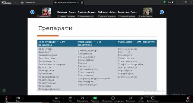 Після вступного слова завідувача кафедри д. с.-г. наук, професора, академіка НААН України Світлани КАЛЕНСЬКОЇ Максим РИБІЦЬКИЙ надав інформацію щодо сучасних тенденцій обмеження та заборони окремих діючих речовин у країнах ЄС та їх можливі наслідки для українського аграрного виробництва.