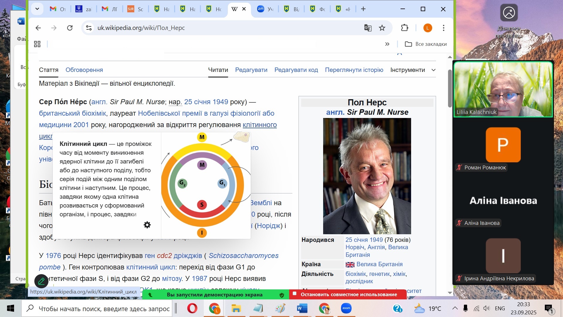 Гуртківці ознайомилися з дослідженнями Пола Нерса - британського біохіміка, лауреата Нобелівської премії в галузі фізіології або медицини 2001 року, який нагороджений за відкриття регулювання клітинного циклу евкаріотів циклінами й циклін-залежними кіназами.