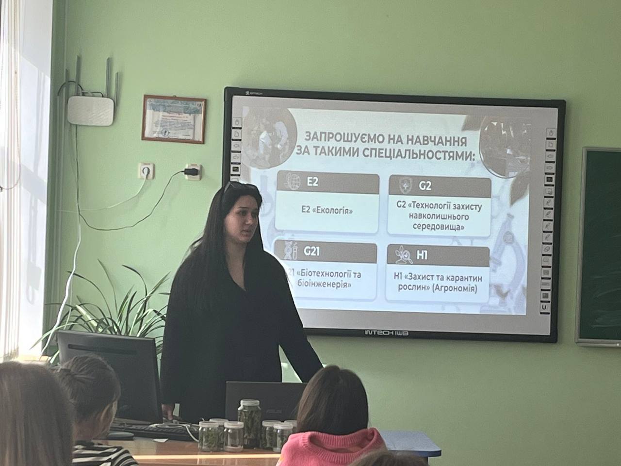Під час зустрічі випускниця ліцею, а нині магістр 1 року навчання Яна ТАРАТУТО розповіла про навчання в університеті, особливості освітніх програм факультету захисту рослин, біотехнологій та екології, перспективи майбутньої професії, а також захопливі аспекти студентського життя – культурно-масові заходи, спортивні змагання, вечірки, конференції та фестивалі.