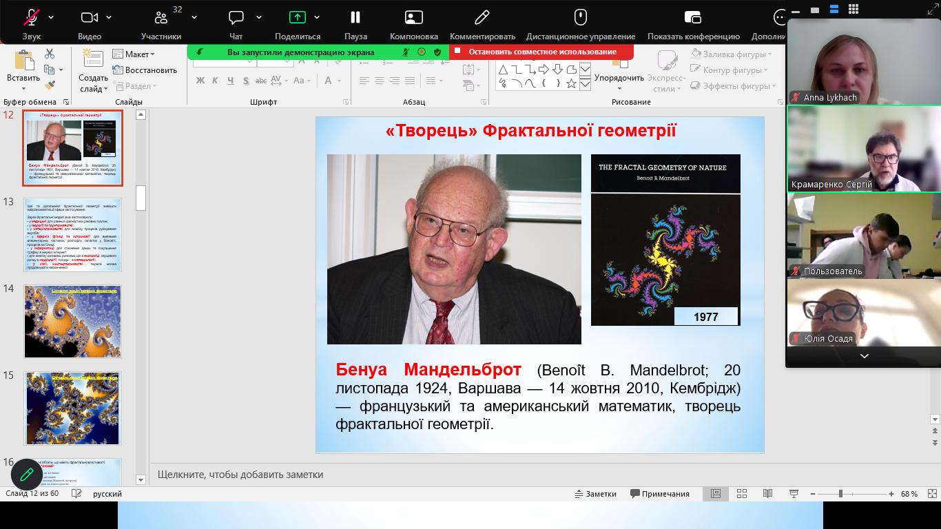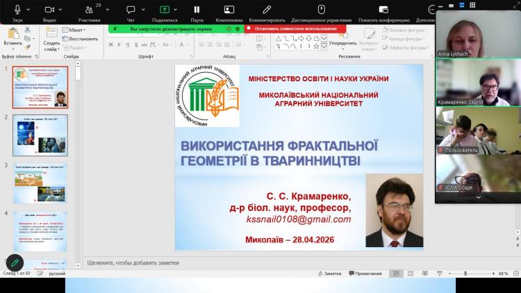 Гостьовим лектором виступив доктор біологічних наук, професор Сергій Сергійович КРАМАРЕНКО, який представив фундаментальні засади фрактальної геометрії та продемонстрував її практичне значення у дослідженнях у галузі тваринництва. У своїх виступах він послідовно розкрив поняття фракталу як структури, що характеризується самоподібністю на різних масштабах, а також пояснив сутність фрактальної розмірності як кількісного показника складності об’єктів і процесів. Особливий акцент було зроблено на тому, що на відміну від класичних геометричних підходів, фрактальна геометрія дозволяє аналізувати природні об’єкти та біологічні системи, які мають нерегулярну, складну та стохастичну природу, що є типовим для живих організмів.