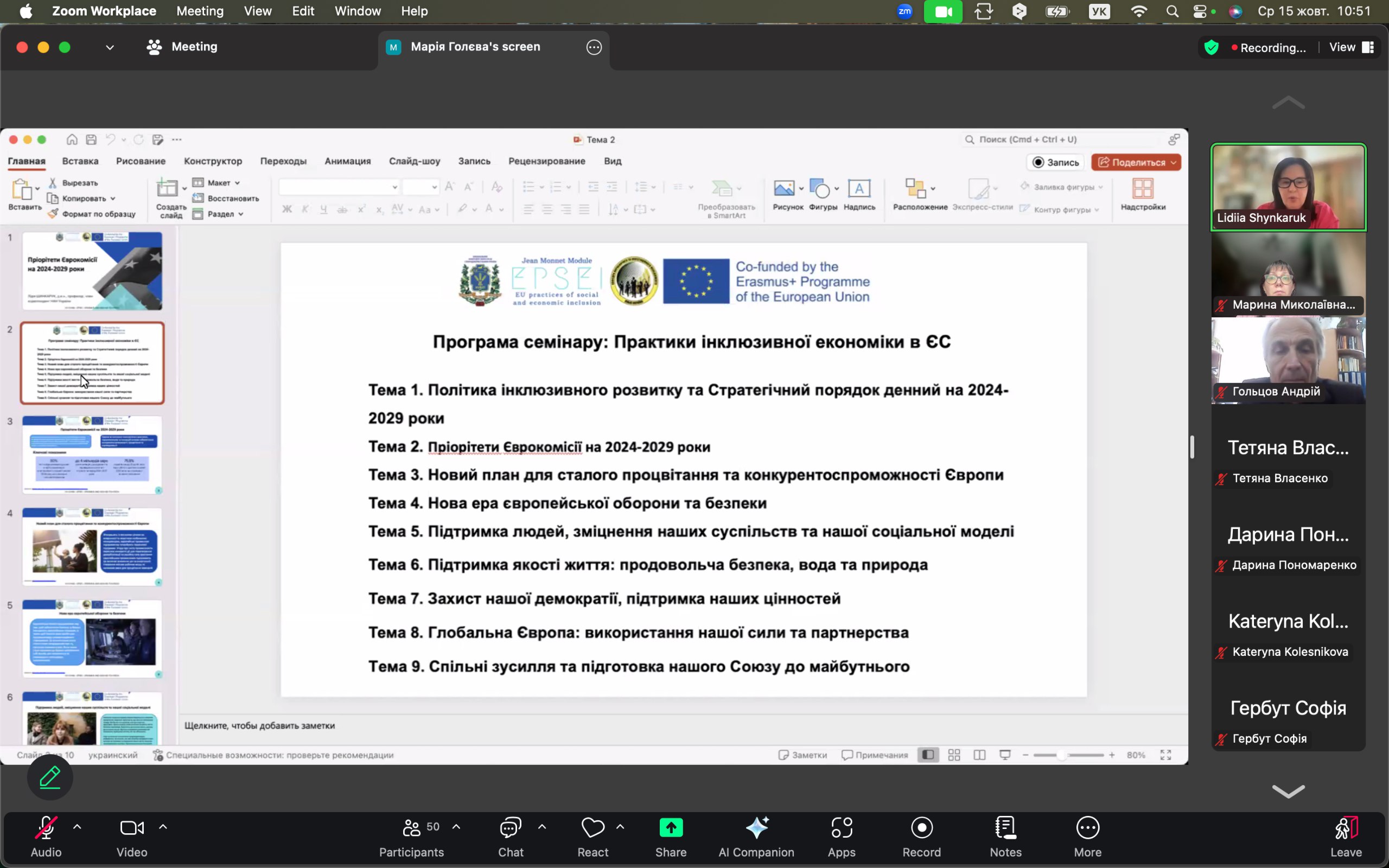 Продовження обговорення зазначених тематичних напрямів відбулося в онлайн-форматі. Наукове поглиблення окремих питань, представлених під час семінару висвітлила д.е.н., професор Лідія ШИНКАРУК. Онлайн-заняття стало логічним продовженням офлайн-зустрічей, сприяючи розширенню кола учасників та поглибленню знань щодо європейських практик соціально-економічної інклюзії.