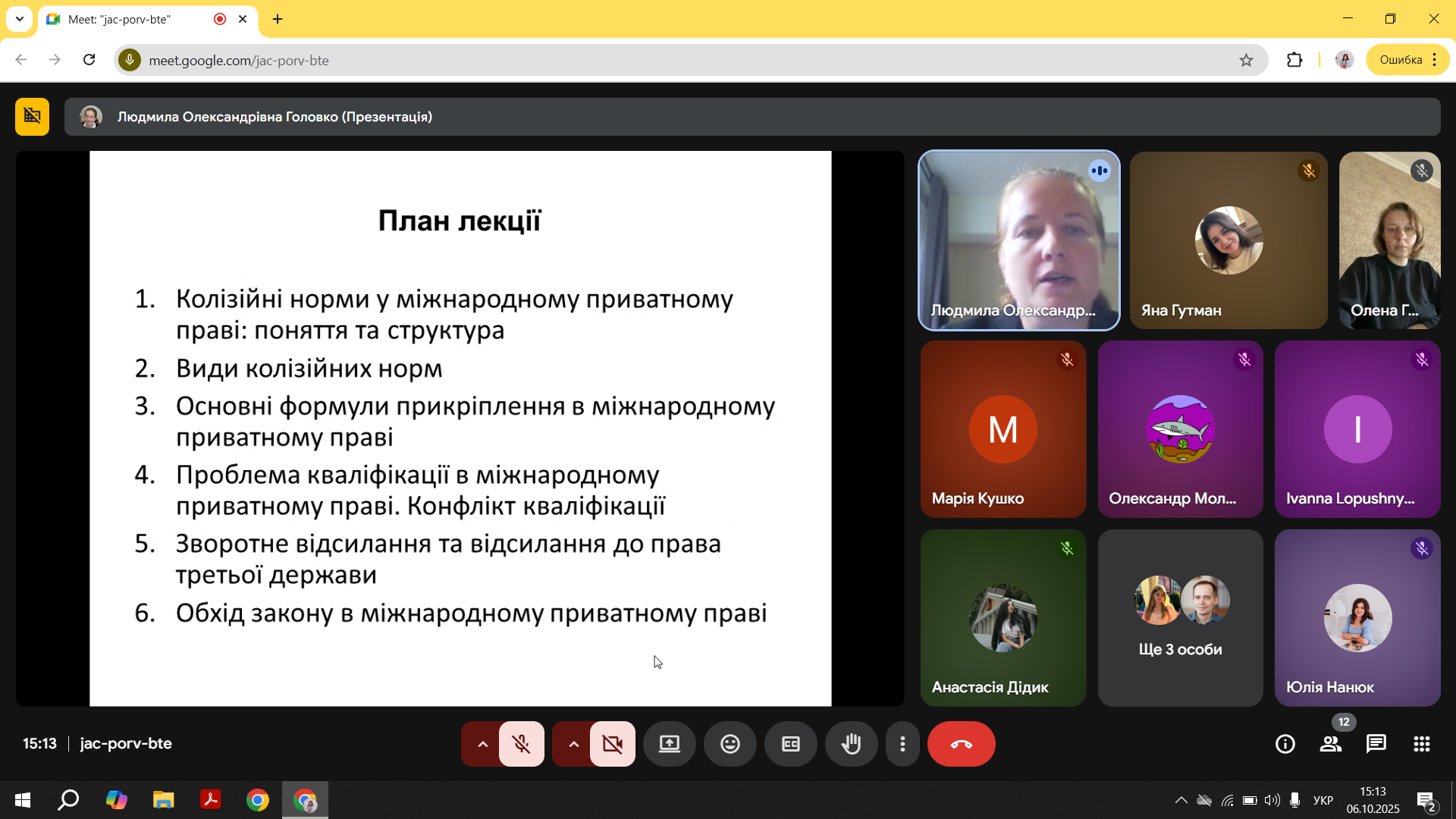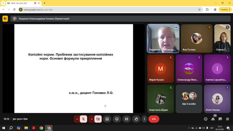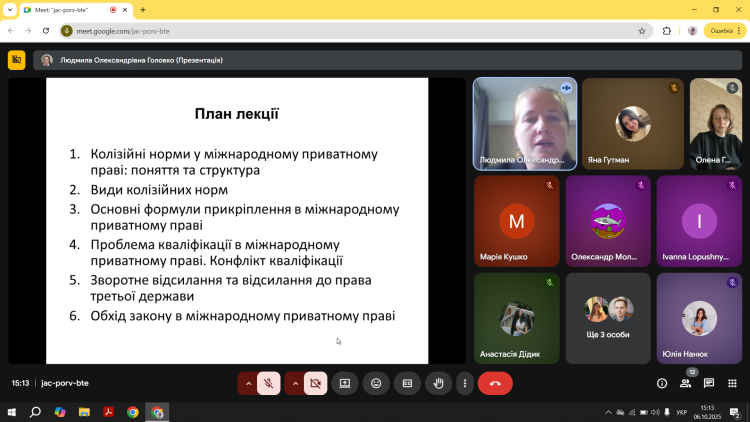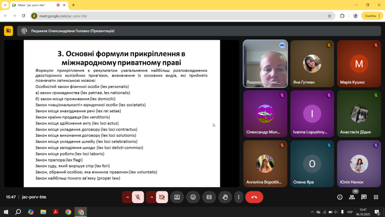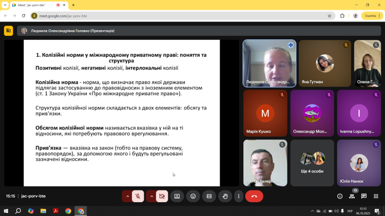 06 жовтня 2025 року доцентом кафедри міжнародного права та порівняльного правознавства, к.ю.н., доцентом Головко Людмилою Олександрівною була проведена відкрита лекція з навчальної дисципліни: «Міжнародне приватне право» для студентів-магістрів дистанційної форми навчання юридичного факультету.