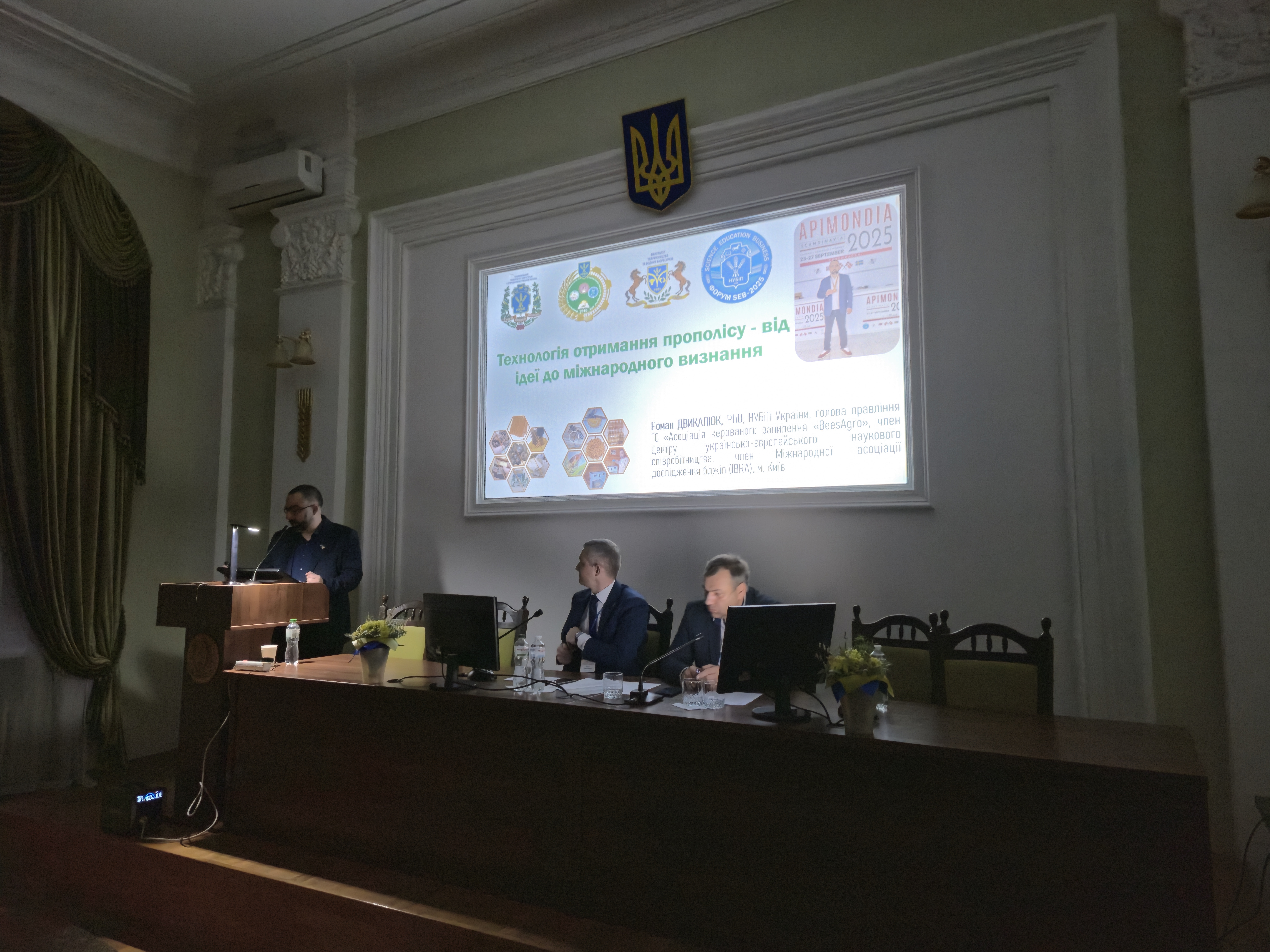 Роман ДВИКАЛЮК, голова правління ГС «Асоціація керованого запилення BeesAgro», поділився досвідом розробки технології отримання прополісу, яка вже здобула міжнародне визнання — бронзова медаль за розробку на світовому конгресі «Апімондія».