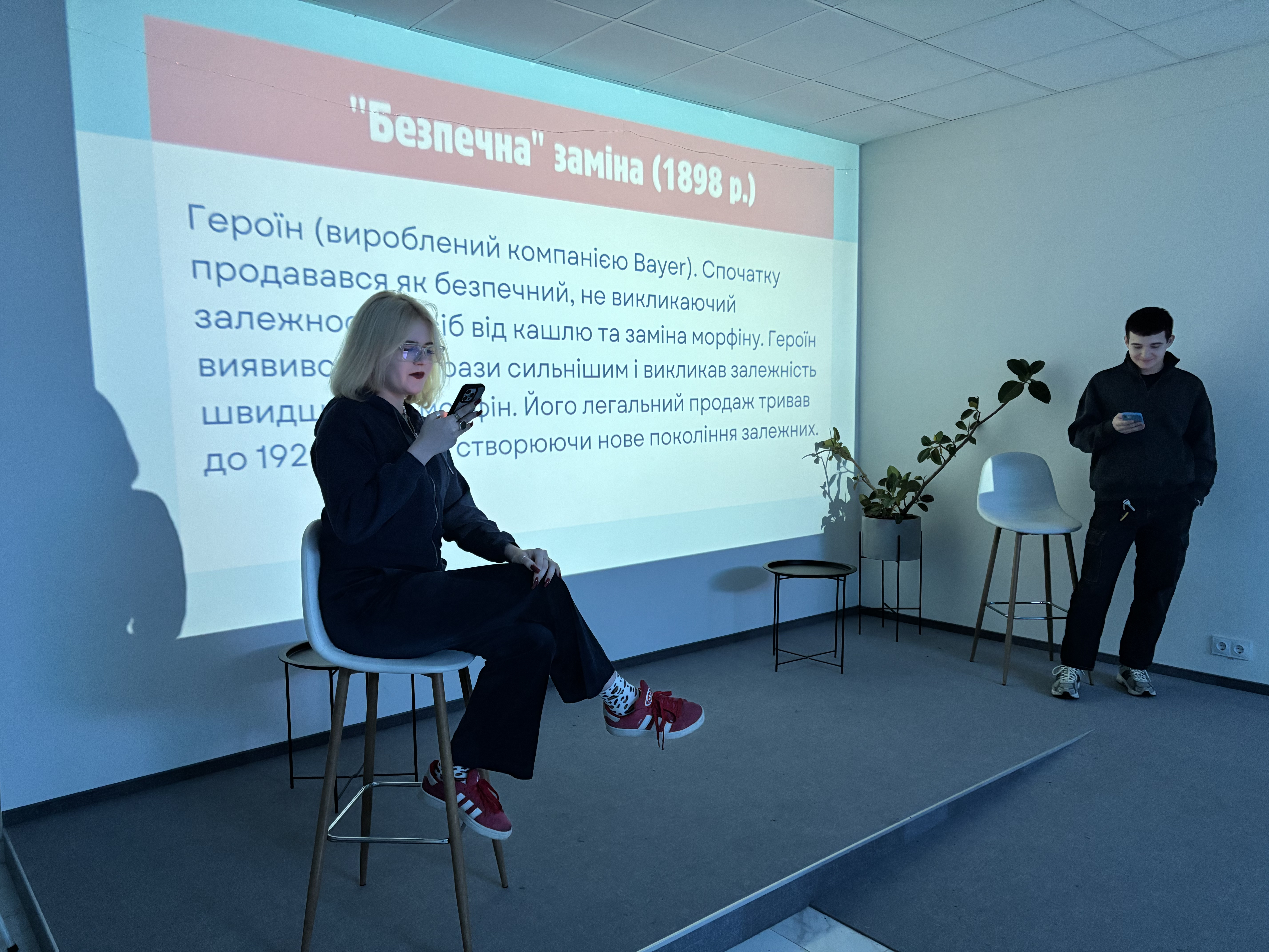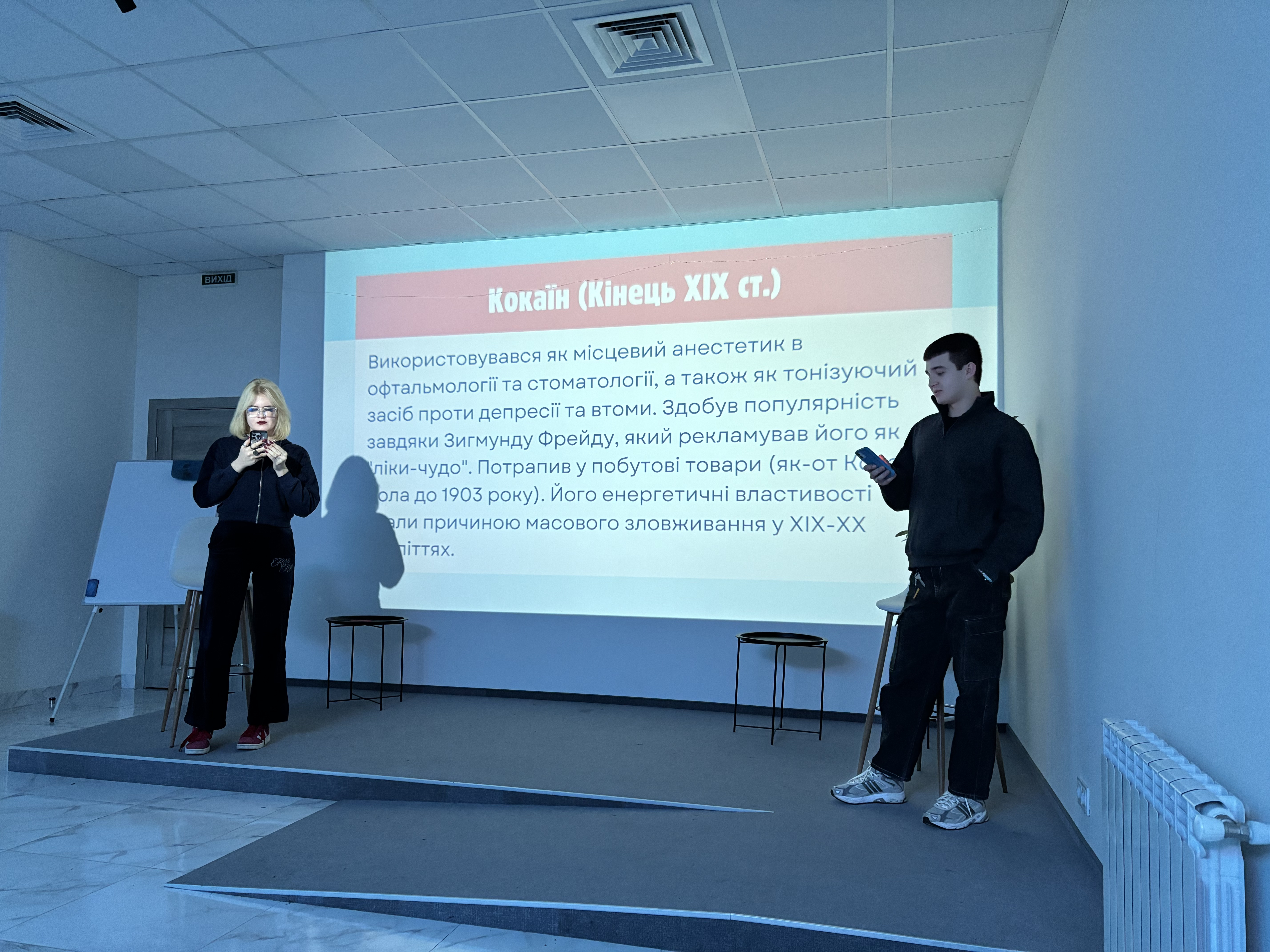 Під час заходу учасники ознайомилися з історією появи наркотичних засобів — від перших згадок у давніх цивілізаціях до сучасної глобальної проблеми залежностей. Лектори Роман ТАРАКАНОВ та Поліна ЄФІМЕНКО, розповіли, чому люди почали вживати психоактивні речовини, які соціальні, психологічні та культурні фактори впливали на поширення цих практик у різні історичні періоди.
