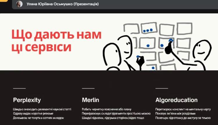 Крім огляду інструментів підтримки власного навчання та саморозвитку, студенти створили колективну карту власного бачення перспектив та ризиків застосування штучного інтелекту в сучасній освіті, а також приділили увагу моделюванню умов навчання в університеті.