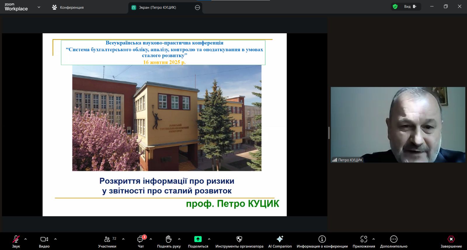 Ректор Львівського торговельно-економічного університету професор Петро КУЦИК звернув увагу присутніх на необхідність розкриття інформації про ризики у звітності зі сталого розвитку та пропозиціях щодо удосконалення структури даного звіту, наголосив на ролі фахівців з обліку і оподаткування у формуванні цього звіту.