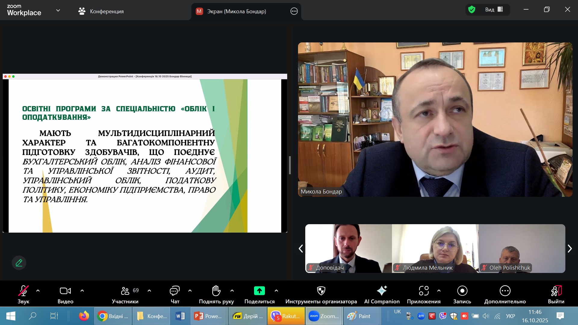 Микола БОНДАР – декан факультету обліку та податкового менеджменту Київського національного економічного університету імені Вадима Гетьмана – акцентував увагу учасників конференції на сучасних викликах та тенденціях розвитку науки та освіти. Відмітивши, що виклики до змісту та ролі спеціальності «Облік і оподаткування» вимагають також оновлення підходів до та науки. Висловився про недоречність і передчасність запровадження ЄДКІ для спеціальності «Облік і оподаткування» в умовах воєнного стану.