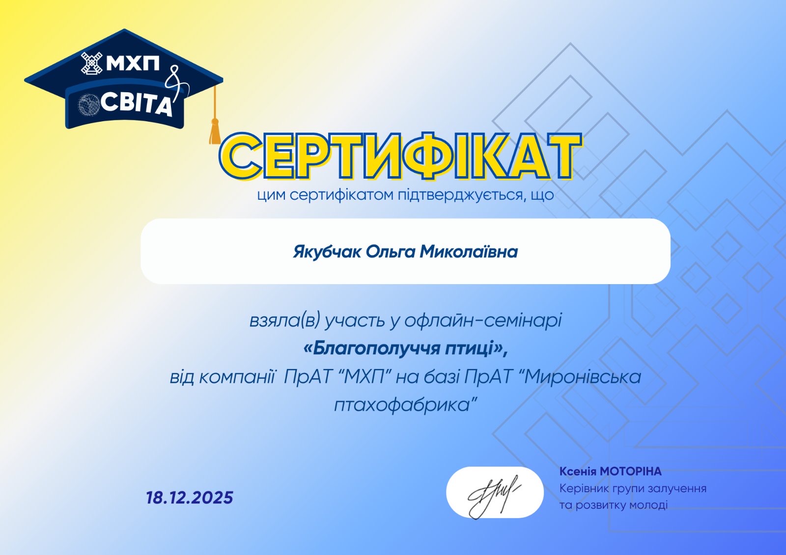 Співробітники кафедри гігієни тварин і харчових продуктів імені професора А.К.Скороходька прийняли участь у офлайн семінарі "Благополуччя птиці", організований компанією ПрАТ МХП "Миронівська птахофабрика" та отримали сертифікати.