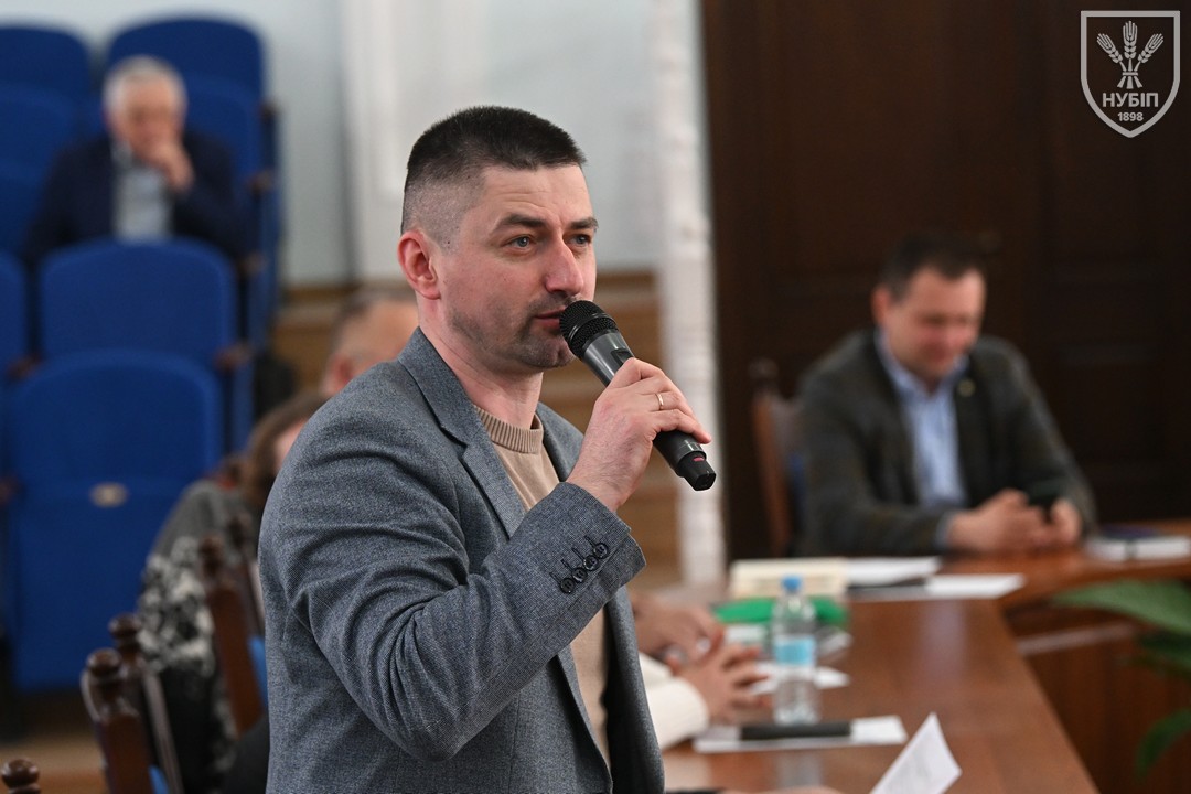 Роман ВАСИЛИШИН, директор ННІ лісового і садово-паркового господарства НУБіП: «…Науковці повинні формувати наукові прогнози, які будуть формувати основу прийняття управлінських рішень, а з іншого боку, мають формувати освітній контент, який має виховувати в майбутніх фахівцях вміння враховувати питання господарювання в повоєнних лісах і вирішувати як екологічні так і економічні проблеми».