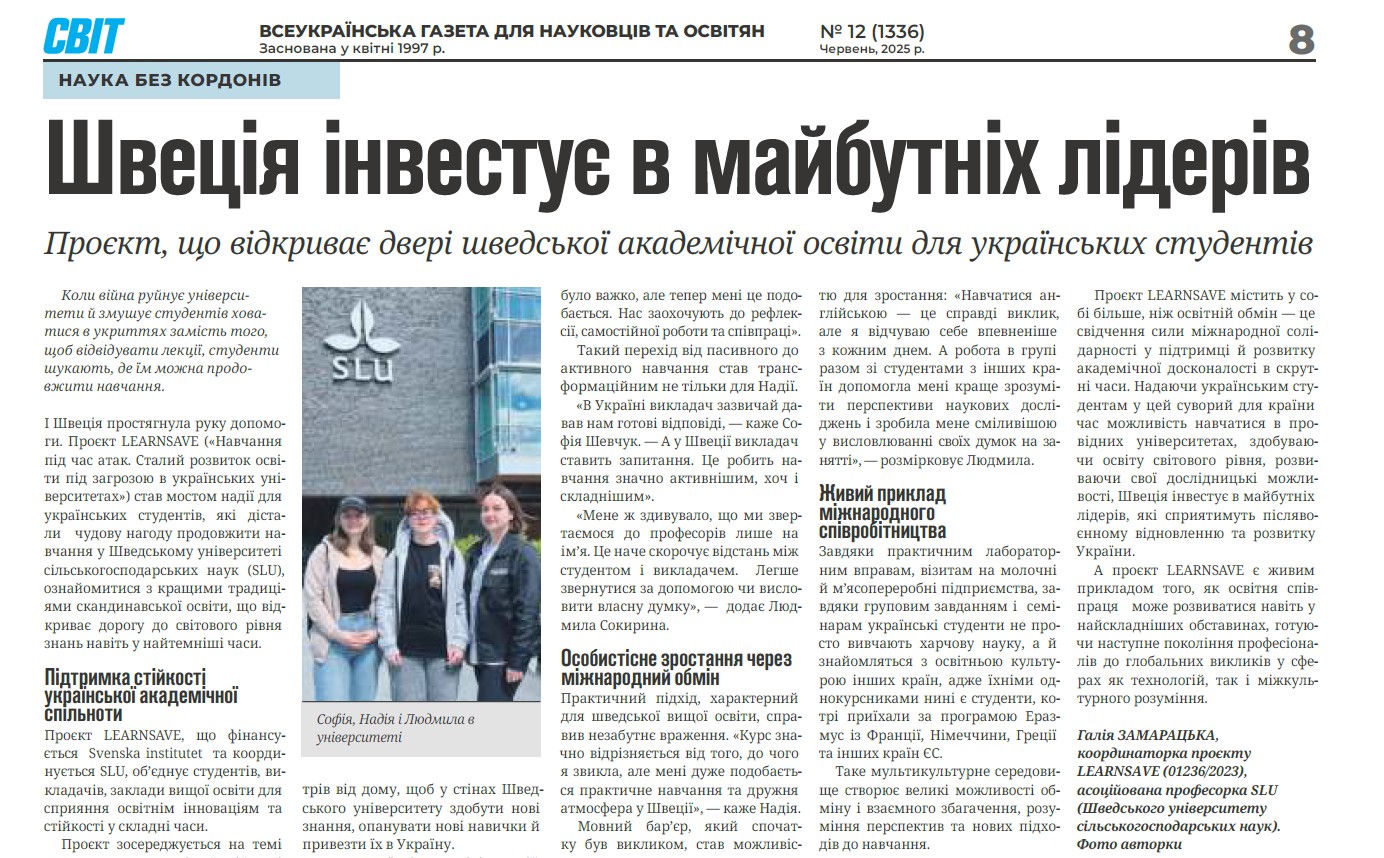 Приємно відмітити, що здобутки проекту LEARNSAVE висвітлюють не лише члени консорціуму, а і періодичні видання. Так, у всеукраїнській газеті для науковців та освітян «Світ. Наука без кордонів» Галія Замарацька опублікувала статтю на тему: «Швеція інвестує в майбутніх лідерів. Проект, що відкриває двері шведської академічної освіти для українських студентів» та зазначає, що «проект LEARNSAVE є живим прикладом того, як освітня співпраця може розвиватися навіть у найскладніших обставинах, готуючи наступне покоління професіоналів до глобальних викликів у сферах як технологій, так і міжкультурного розуміння».